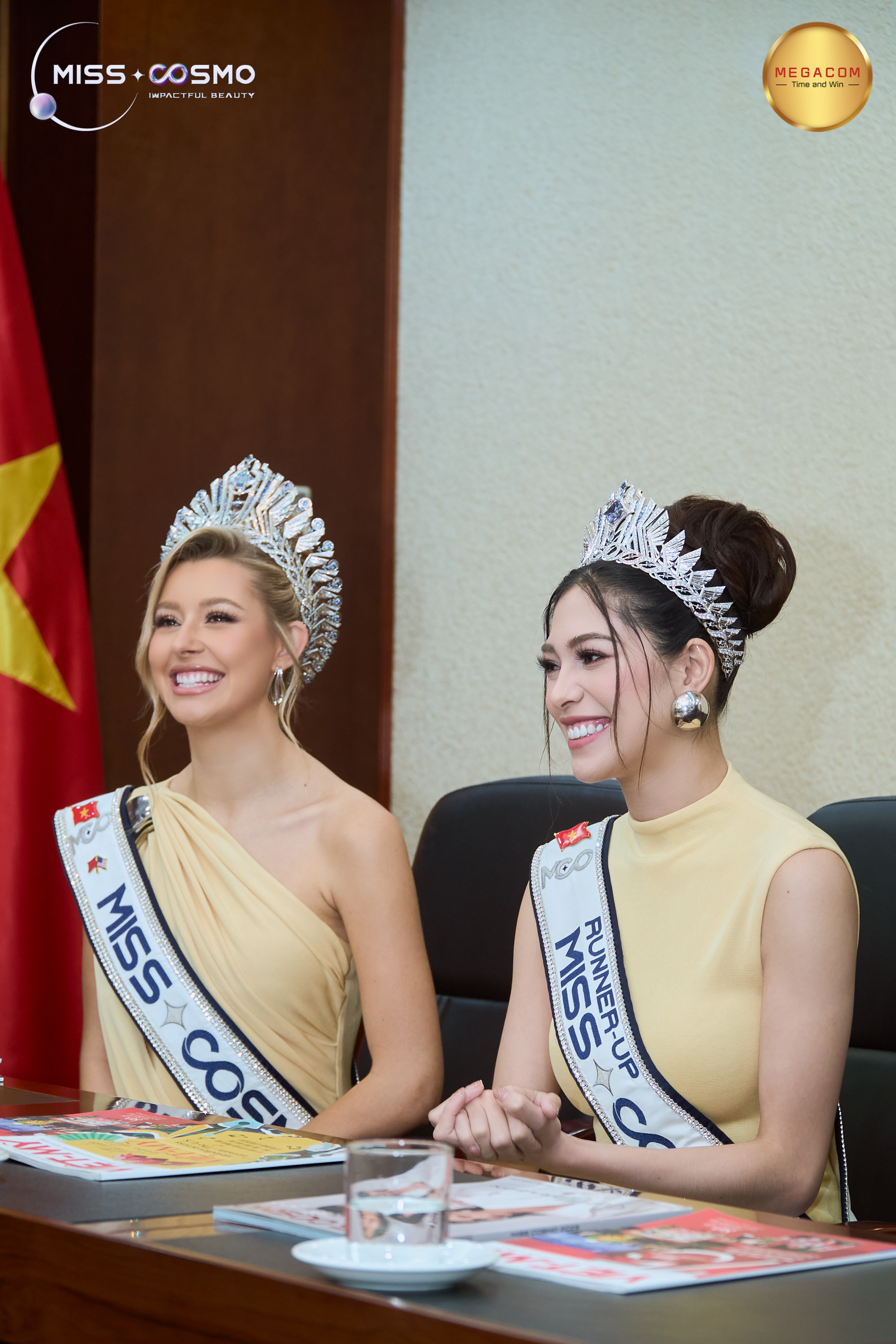 Hoa hậu Yolina Linquist (quốc tịch Mỹ, bìa trái) và Á hậu 1 Chelsea Fernandez (quốc tịch Philippines, bìa phải) tại buổi gặp gỡ và làm việc