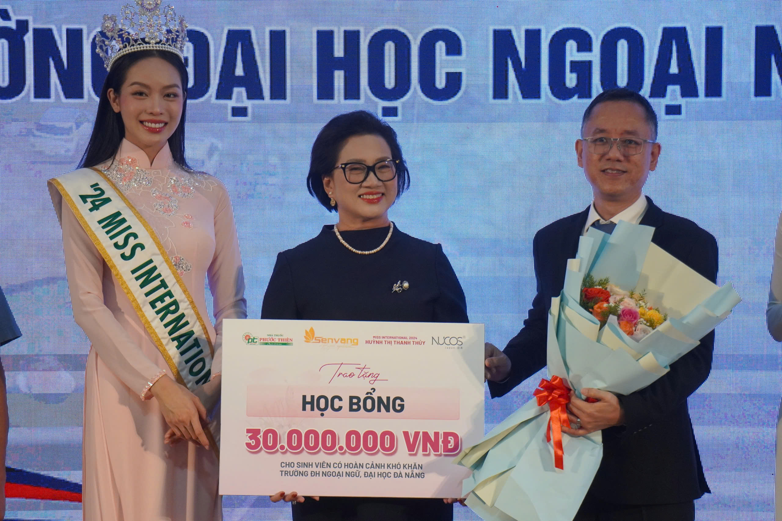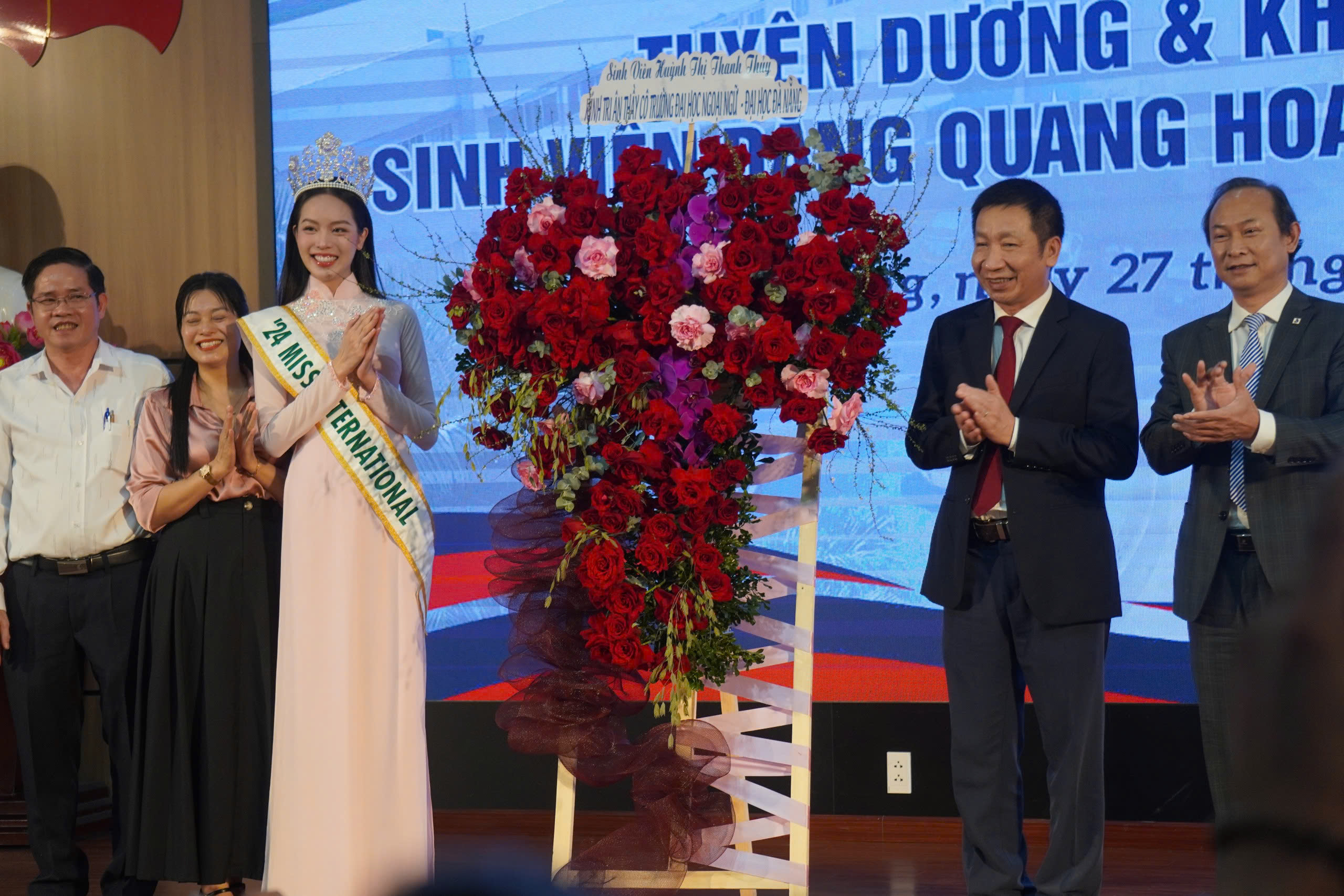 Tại đây, ĐH Đà Nẵng và Trường ĐH Ngoại ngữ đã tổ chức tuyên dương, khen thưởng và trao học bổng cho hoa hậu Thanh Thuỷ.