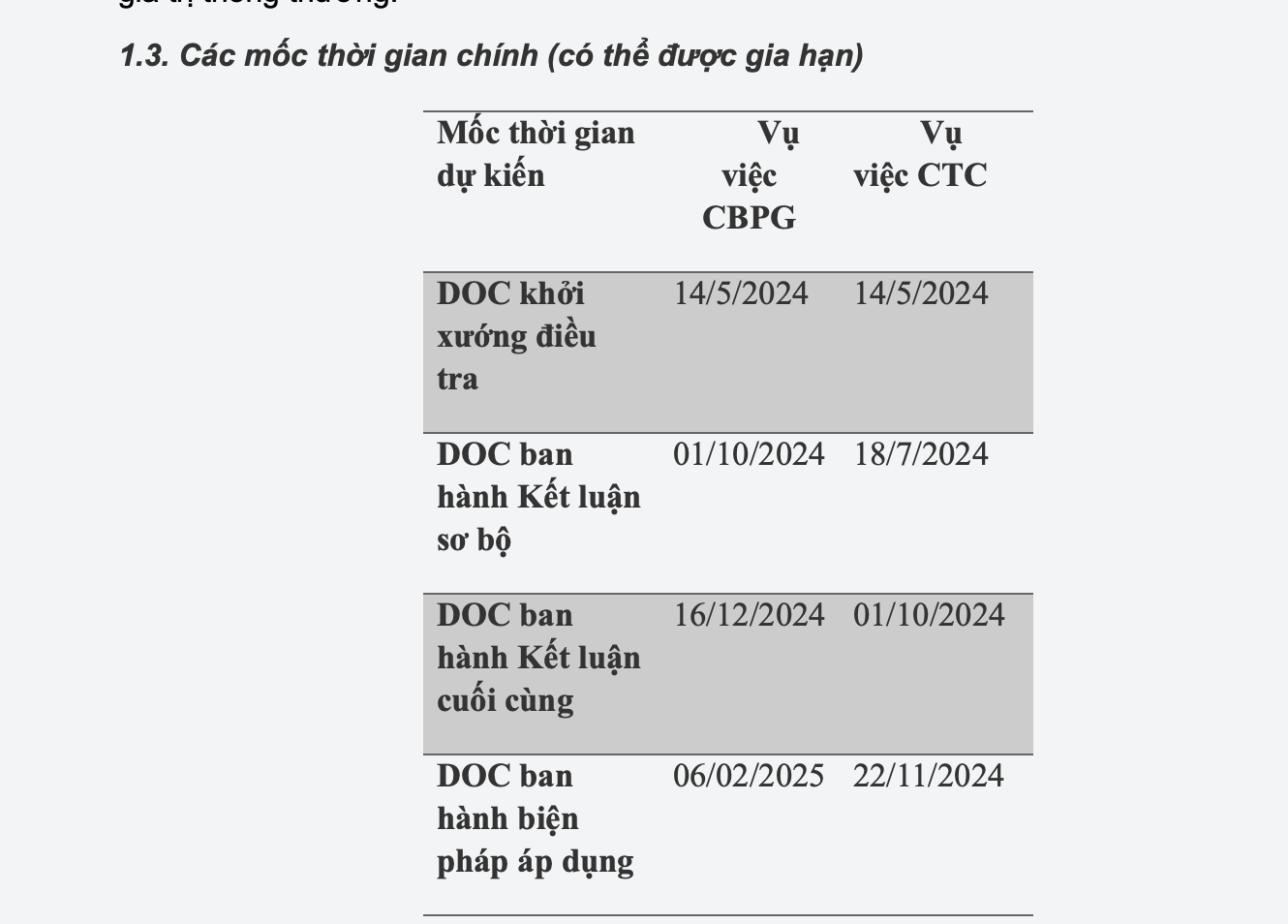 DOC đã ban hành 02 Bản câu hỏi về Lượng và Giá trị trong vụ việc CBPG (thời hạn trả lời được gia hạn đến trước 17 giờ Hoa Kỳ ngày 06 tháng 6 năm 2024) và vụ việc CTC (thời hạn trả lời đến trước 17 giờ Hoa Kỳ ngày 04 tháng 6 năm 2024).