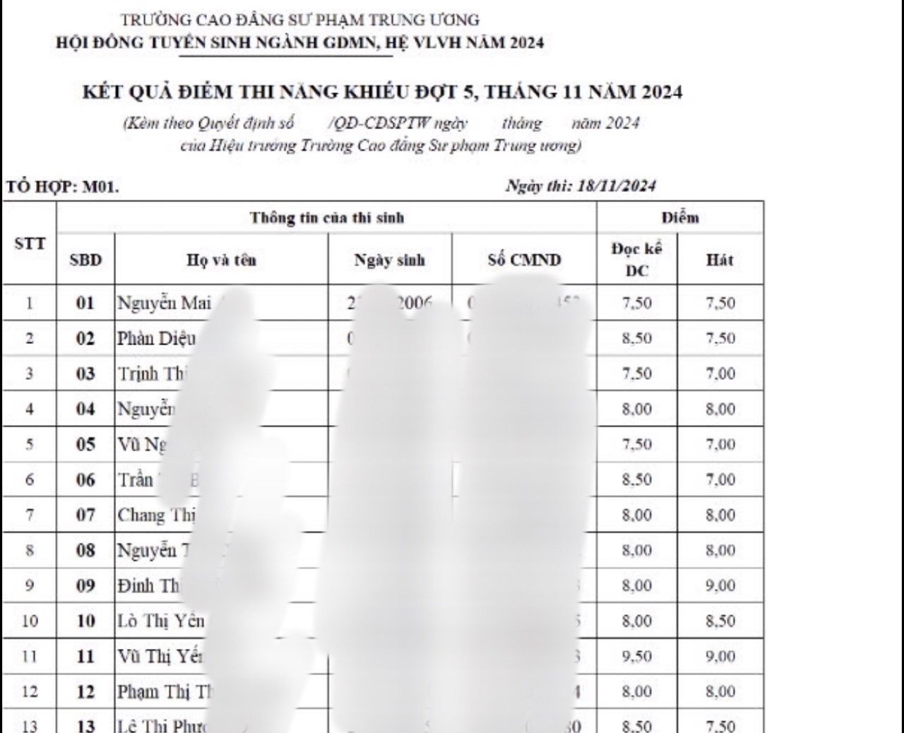 Sau gần 1 tháng có kết quả thi năng khiếu, những thí sinh trúng tuyển đã được nhập học vào ngày 15/12 tại trường Cao đẳng Sư phạm Trung ương mà không có giấy thông báo trúng tuyển.