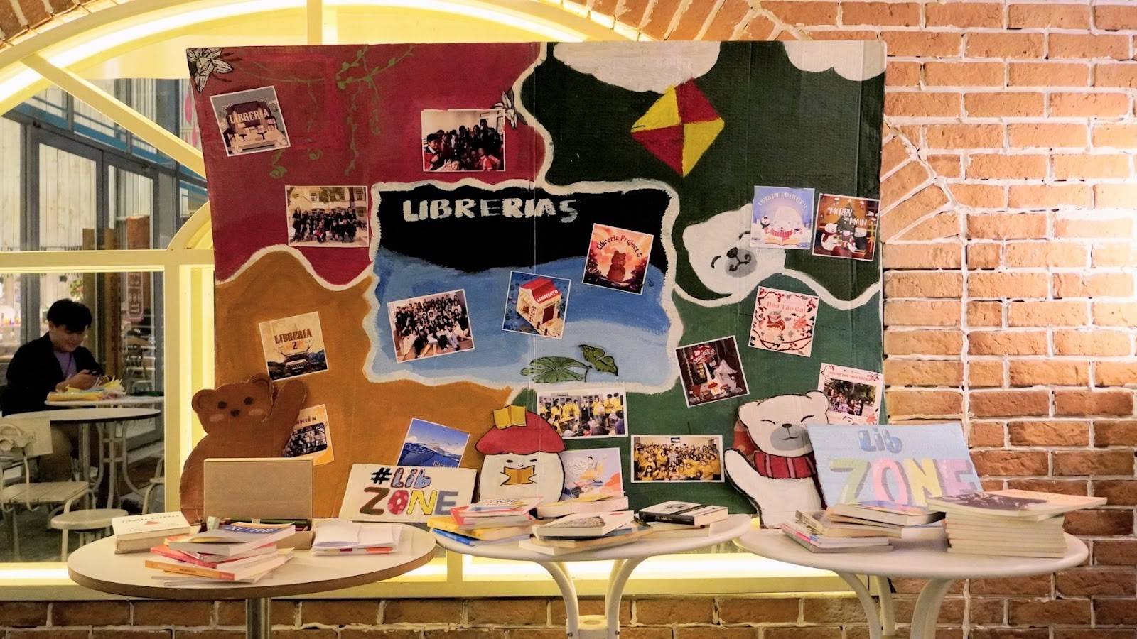 Khu vực Lib Zone ghi lại chặng đường đáng nhớ của Libreria Project qua 5 mùa hoạt động, thêm vào đó là hòm gây quỹ kết hợp với QR 'Học bổng khuyến học'
