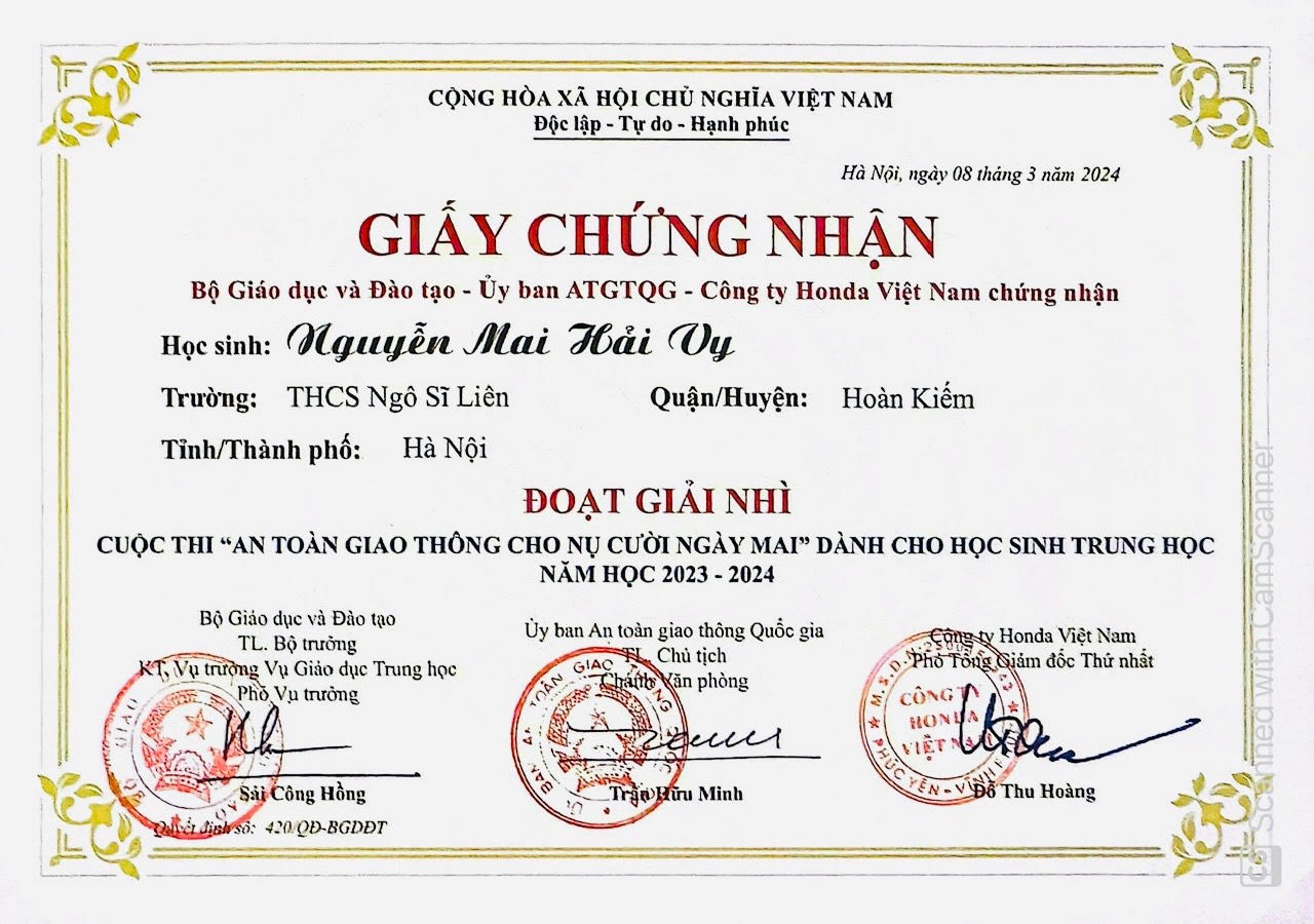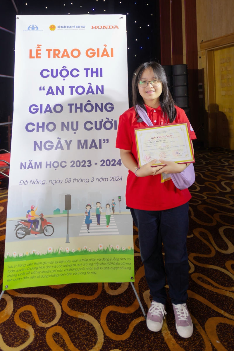 TCVM - Ngày 08/3/2024, bạn Nguyễn Mai Hải Vy - học sinh lớp 9A2, Trường THCS Ngô Sĩ Liên đã nhận giải Nhì trong cuộc thi “An toàn giao thông cho nụ cười ngày mai” cấp Quốc gia tại Đà Nẵng.