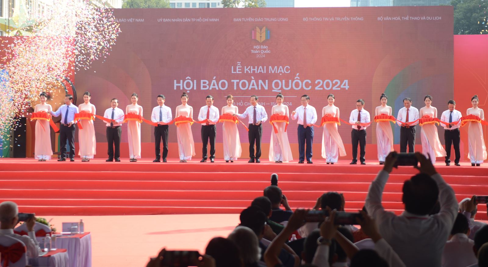 Dự Lễ khai mạc Hội Báo toàn quốc 2024 có các ông Nguyễn Văn Nên, Ủy viên Bộ Chính trị, Bí thư Thành ủy TP Hồ Chí Minh; Nguyễn Trọng Nghĩa, Bí thư Trung ương Đảng, Trưởng Ban Tuyên giáo Trung ương; Trần Lưu Quang, Ủy viên Trung ương Đảng, Phó Thủ tướng Chính phủ; Nguyễn Mạnh Hùng, Ủy viên Trung ương Đảng, Bộ trưởng Bộ Thông tin và Truyền thông; Lê Quốc Minh, Ủy viên Trung ương Đảng, Tổng Biên tập báo Nhân Dân, Phó Trưởng Ban Tuyên giáo Trung ương, Chủ tịch Hội Nhà báo Việt Nam; cùng các lãnh đạo ban, bộ, ngành Trung ương và TP Hồ Chí Minh; lãnh đạo các cơ quan báo chí, lãnh đạo và hội viên hội nhà báo các cấp.