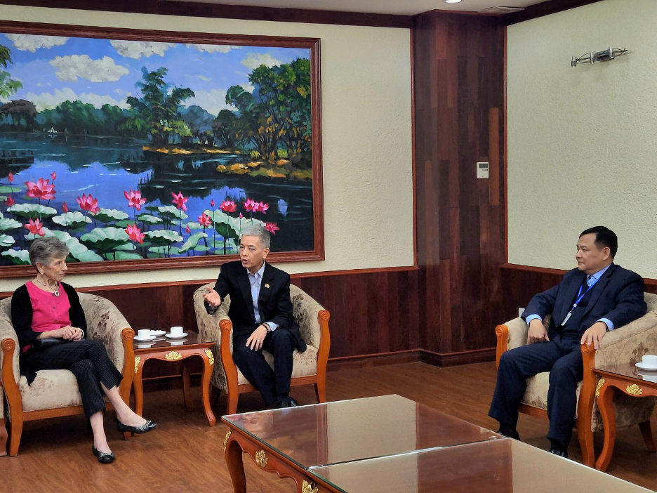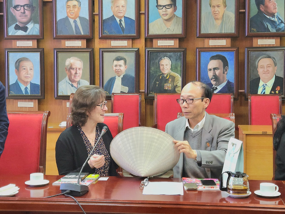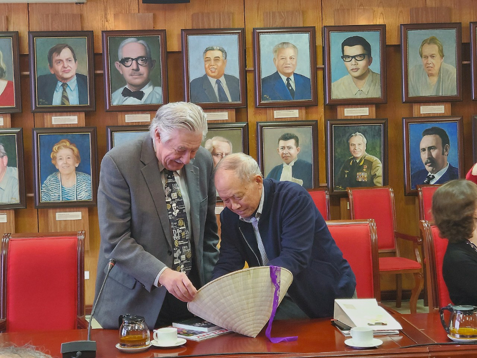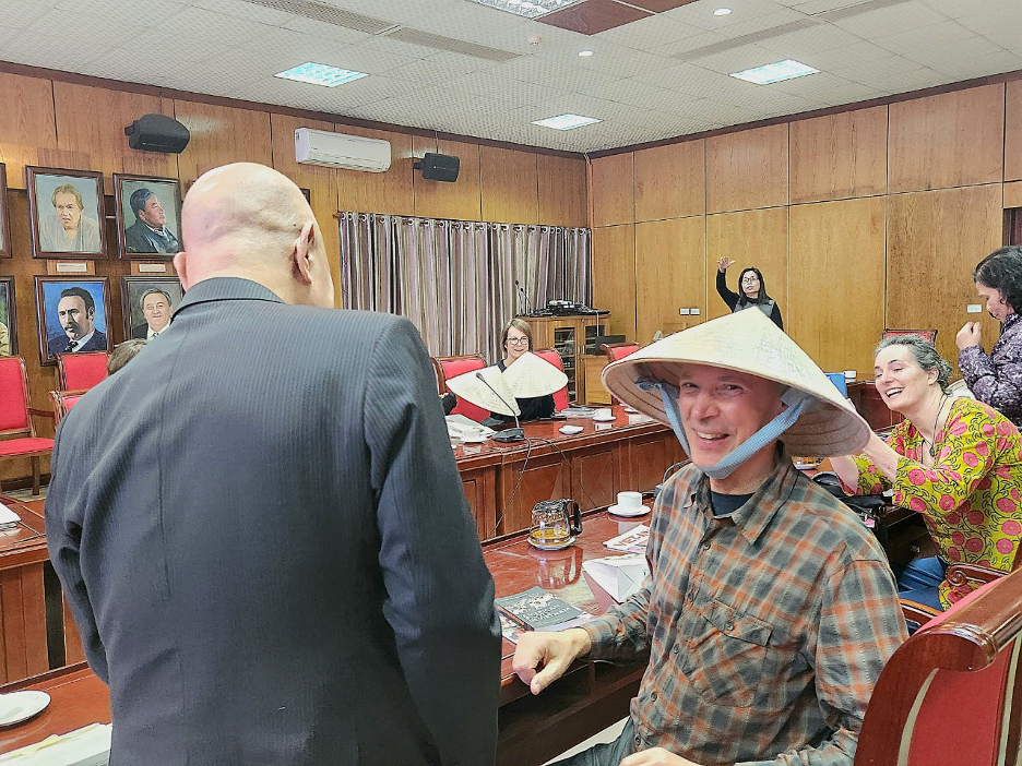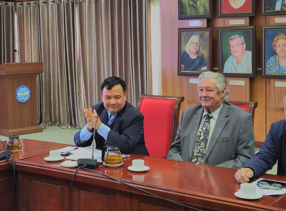 Ông Bùi Thế Giang, Phó Chủ tịch Hội Việt - Mỹ, hoan nghênh đoàn Peace Trees Vietnam đến Việt Nam, thăm Hội Việt - Mỹ và Liên hiệp các tổ chức hữu nghị Việt Nam