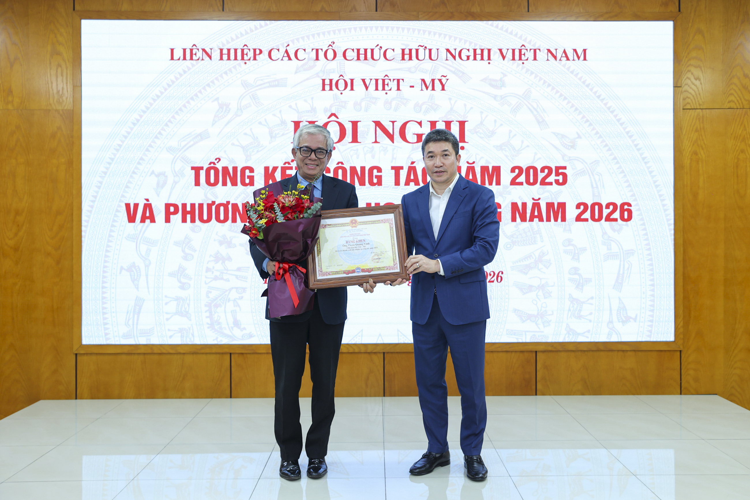 Đại sứ Phạm Quang Vinh (bìa trái) nhận bằng khen "Đã hoàn thành xuất sắc nhiệm vụ công tác năm 2025" của Đoàn Chủ tịch Liên hiệp các tổ chức hữu nghị Việt Nam từ Chủ tịch Phan Anh Sơn. (Ảnh: Đinh Hòa)