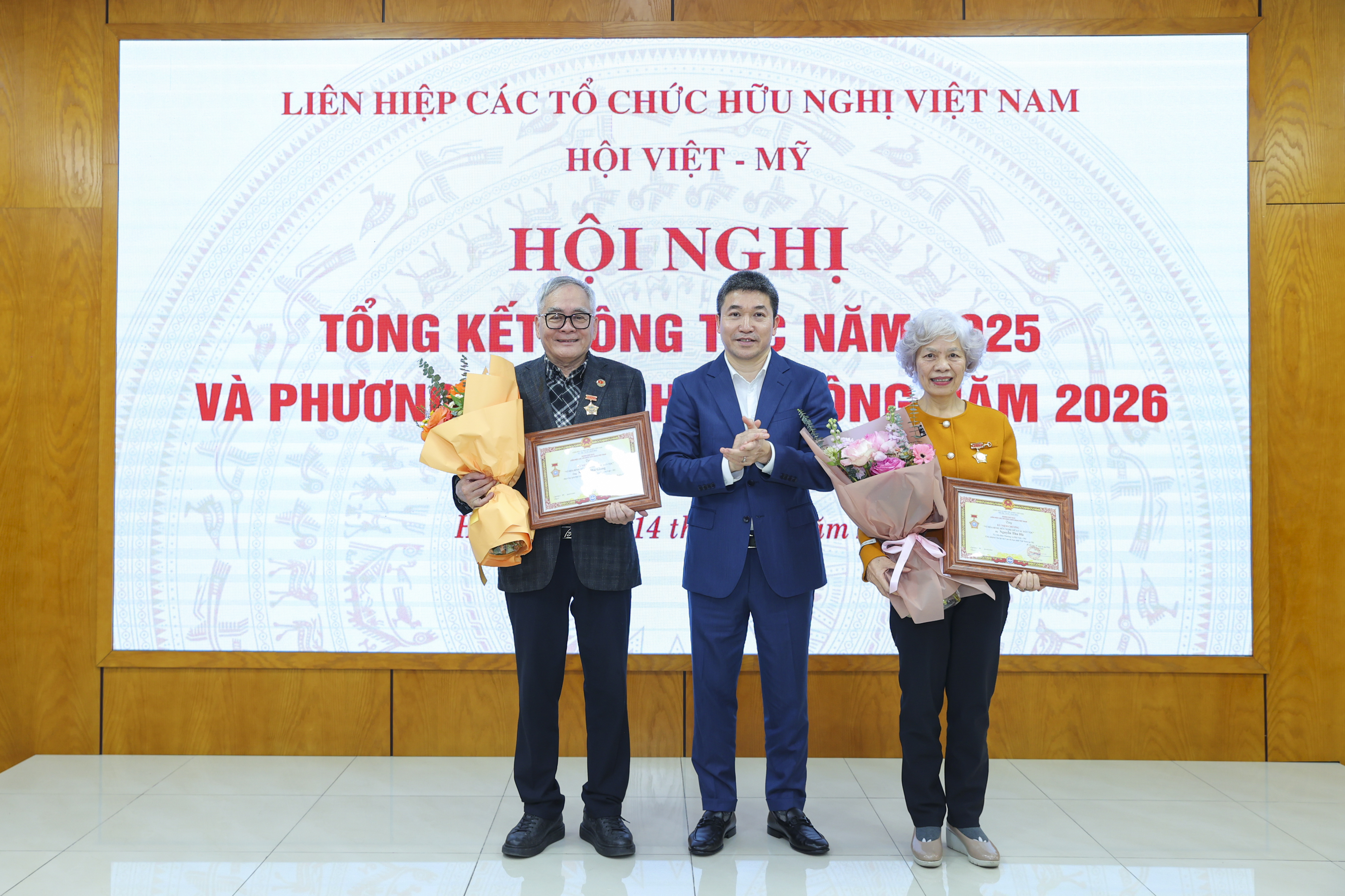 Chủ tịch Phan Anh Sơn (đứng giữa) trao Kỷ niệm chương "Vì hòa bình, hữu nghị giữa các dân tộc" của Đoàn Chủ tịch Liên hiệp các tổ chức hữu nghị Việt Nam cho Nhà báo Nguyễn Hải Giang, Phó chủ tịch Hội Việt - Mỹ, Tổng biên tập Tạp chí Việt - Mỹ (bìa trái) và bà Nguyễn Thu Hà, Ủy viên Ban thường vụ Hội Việt - Mỹ, Chủ nhiệm Câu lạc bộ Cựu du học sinh Việt Nam tại Mỹ (bìa phải). (Ảnh: Đinh Hòa)