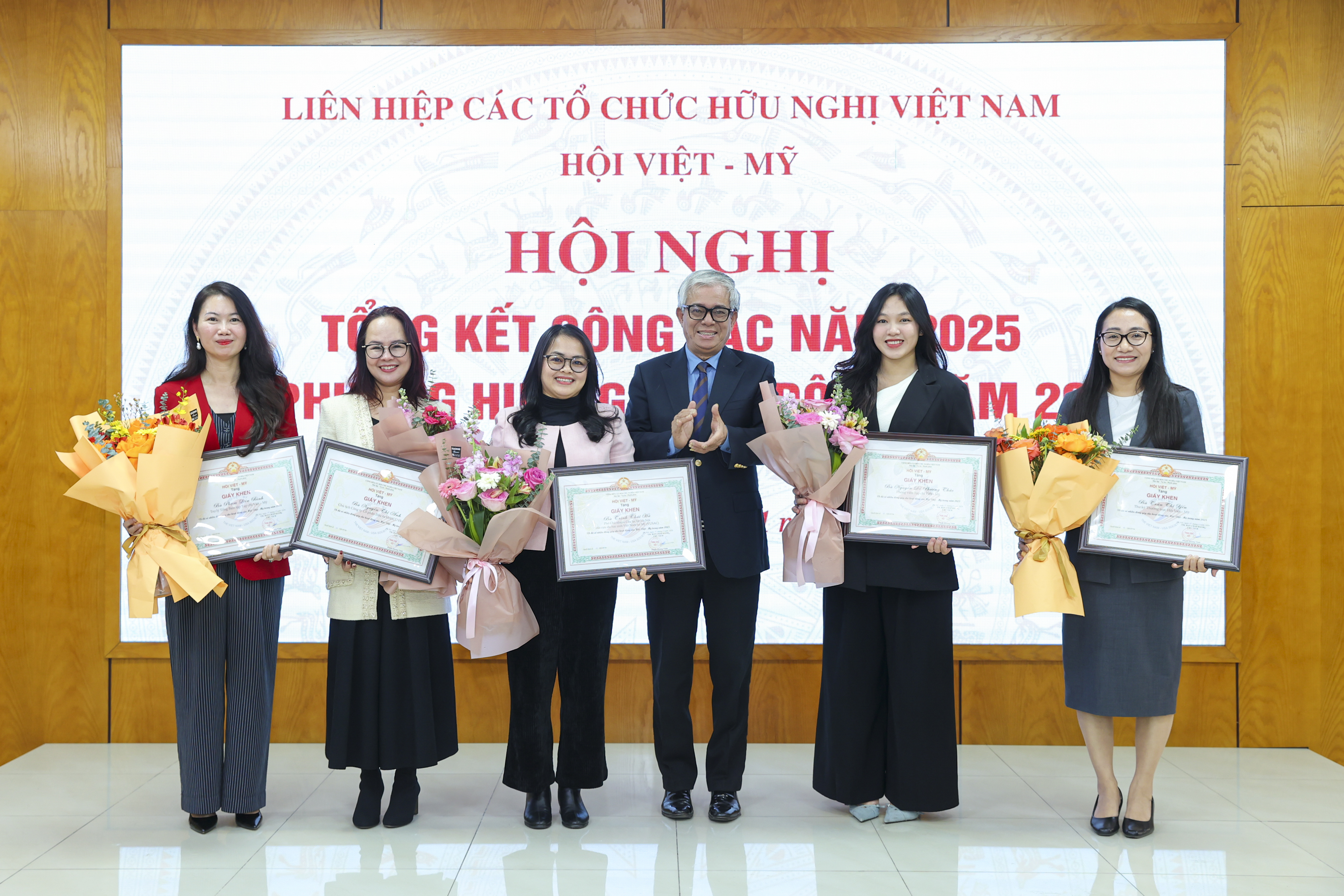 Chủ tịch Phạm Quang Vinh (đứng giữa) trao tặng Giấy khen cho các cá nhân và tổ chức có nhiều đóng góp cho Hôi Việt - Mỹ trong năm 2025. (Ảnh: Đinh Hòa)