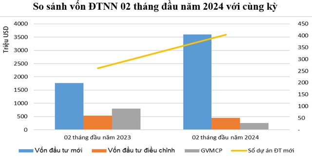 TCVM - Cục Đầu tư nước ngoài (Bộ Kế hoạch và Đầu tư) vừa công bố báo cáo về tình hình thu hút đầu tư nước ngoài (ĐTNN) tại Việt Nam trong 2 tháng đầu năm 2024.