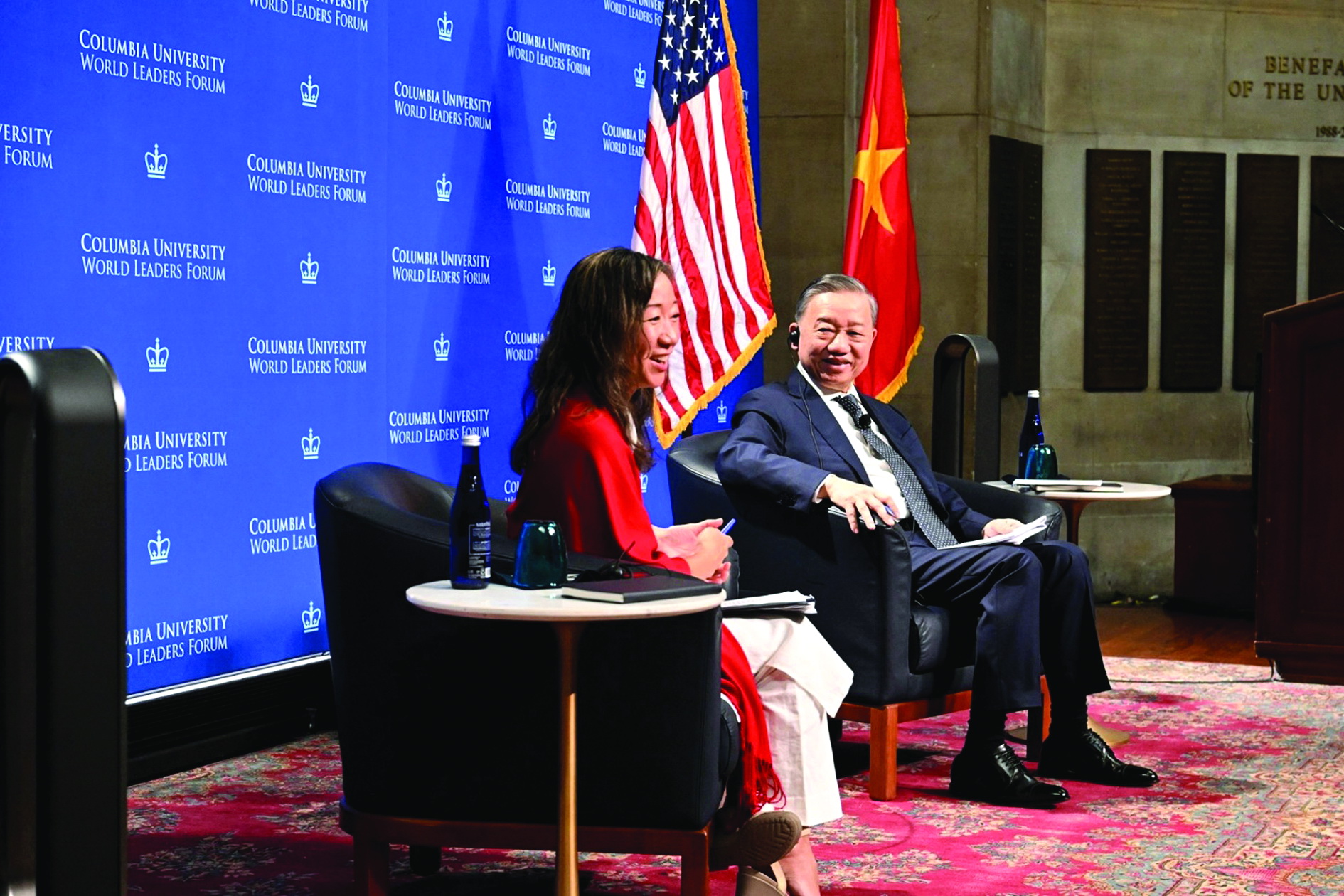 Tổng bí thư Tô Lâm và Giáo sư Liên Hằng tại Diễn đàn Lãnh đạo Thế giới - Đại học Columbia, Mỹ.