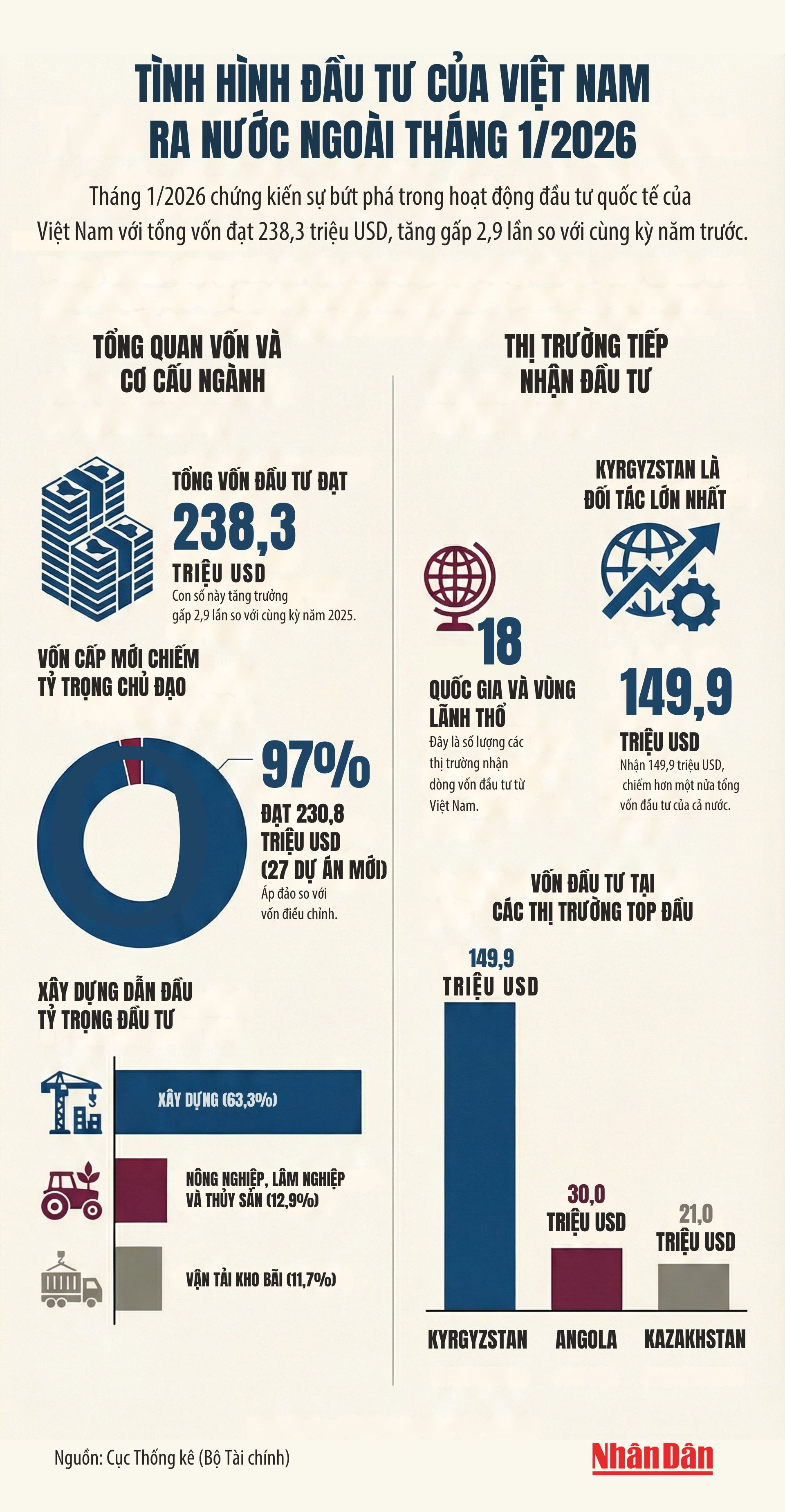 TCVM - Trong tháng 1/2026, tổng vốn đầu tư của Việt Nam ra nước ngoài đạt 238,3 triệu USD, gấp 2,9% so với cùng kỳ năm 2025. Trong đó, vốn cấp mới chiếm phần lớn với 230,8 triệu USD. Ngành xây dựng dẫn đầu với tỷ trọng 63,3%, và Kyrgyzstan là thị trường nhận vốn lớn nhất (149,9 triệu USD).