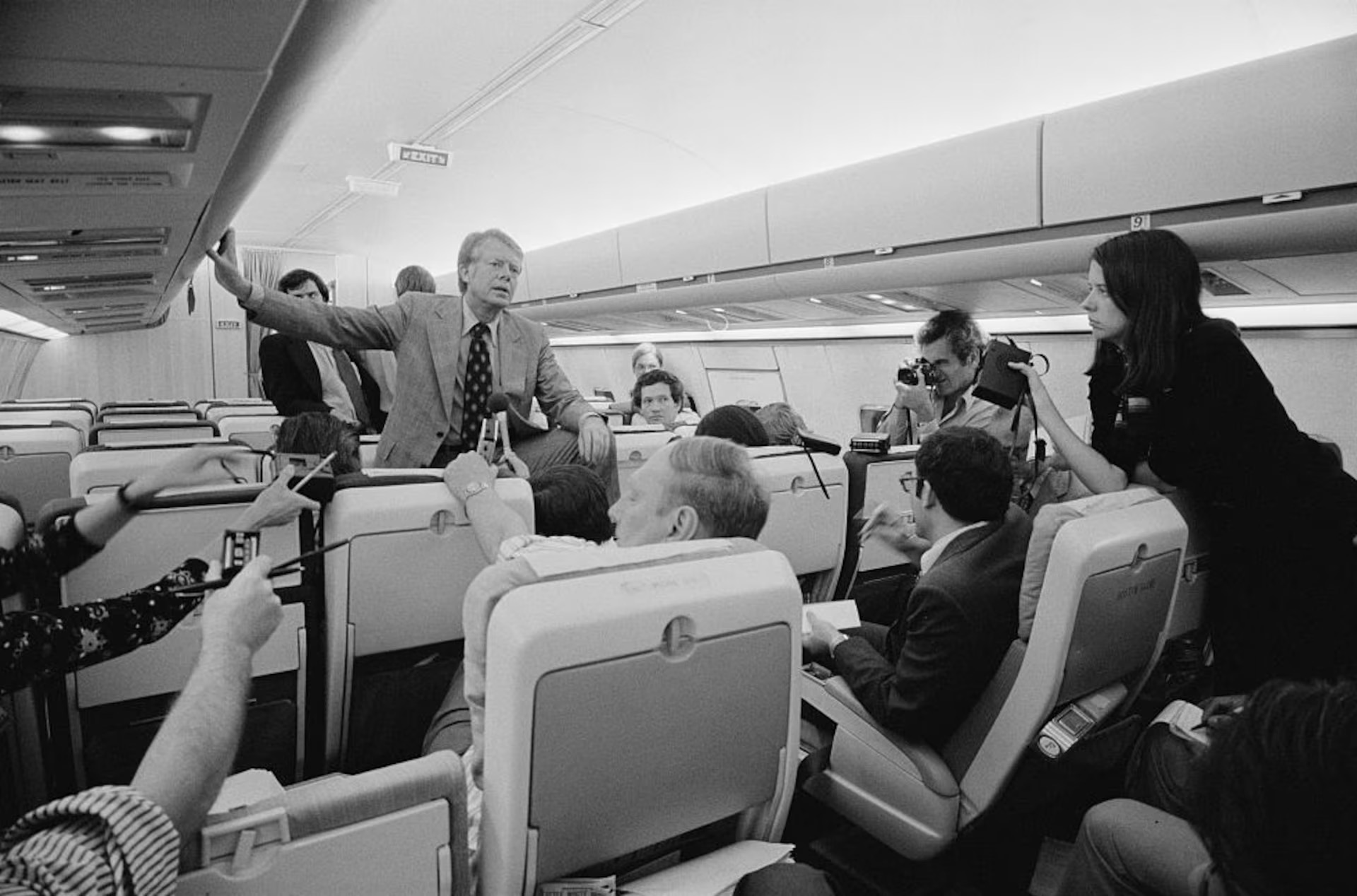 Governor Jimmy Carter holds an informal press conference aboard his plane on a campaign trip, September 11, 1976.