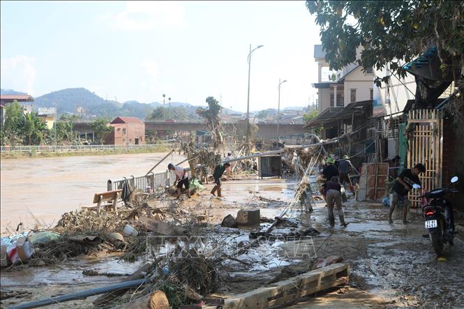 Người dân phường Thục Phán (Cao Bằng) nỗ lực khắc phục hậu quả sau mưa bão. (Ảnh: TTXVN/Chu Hiệu)
