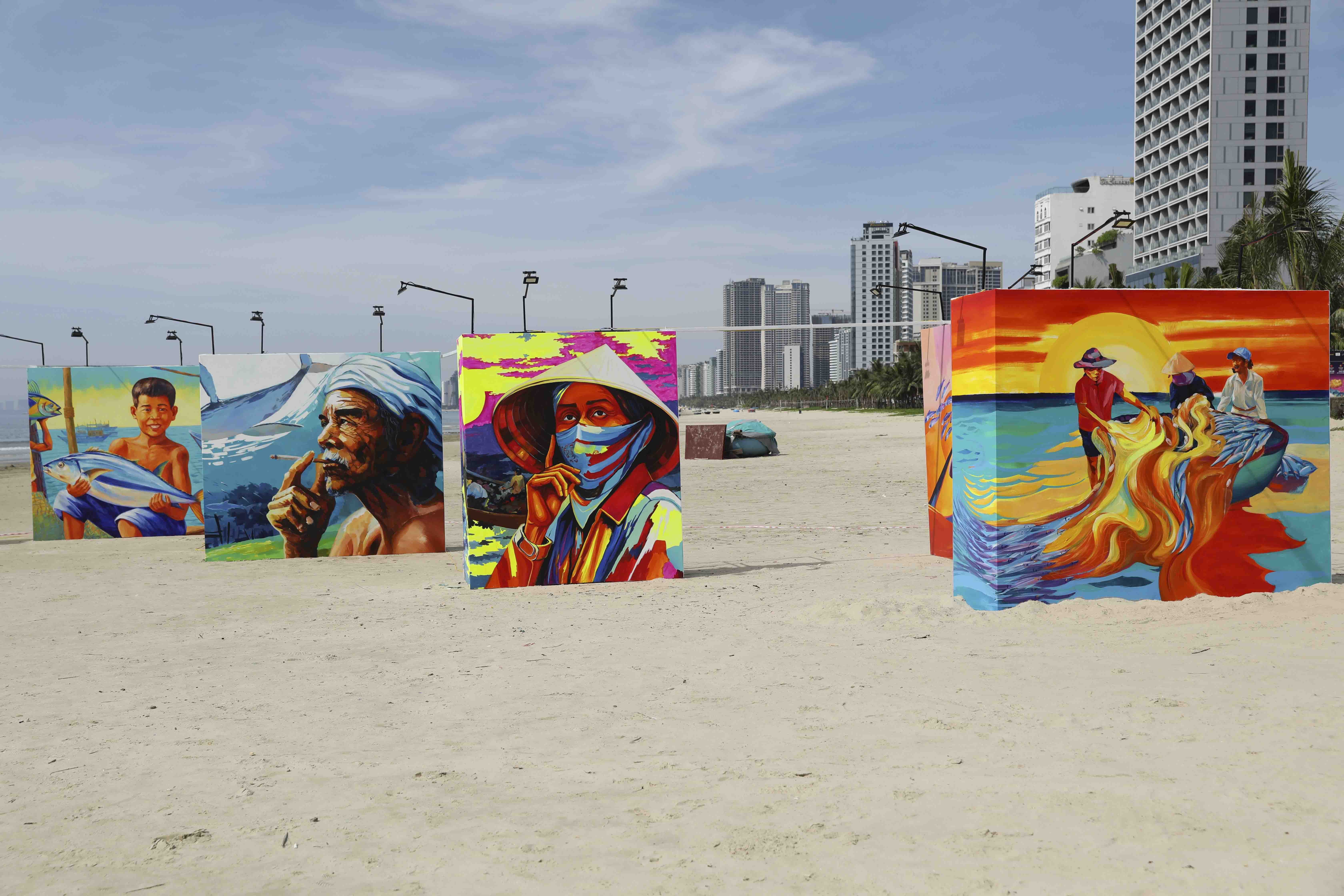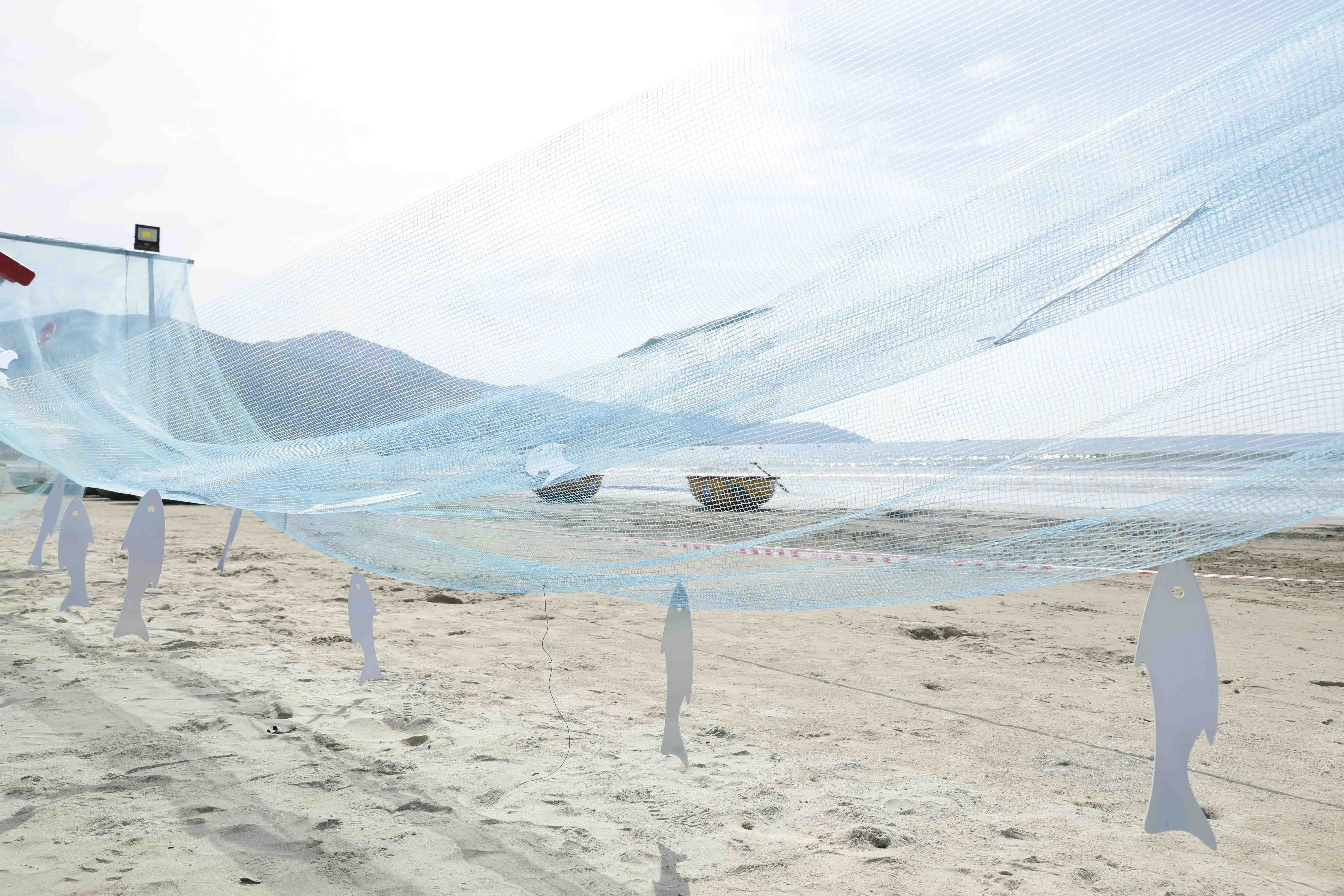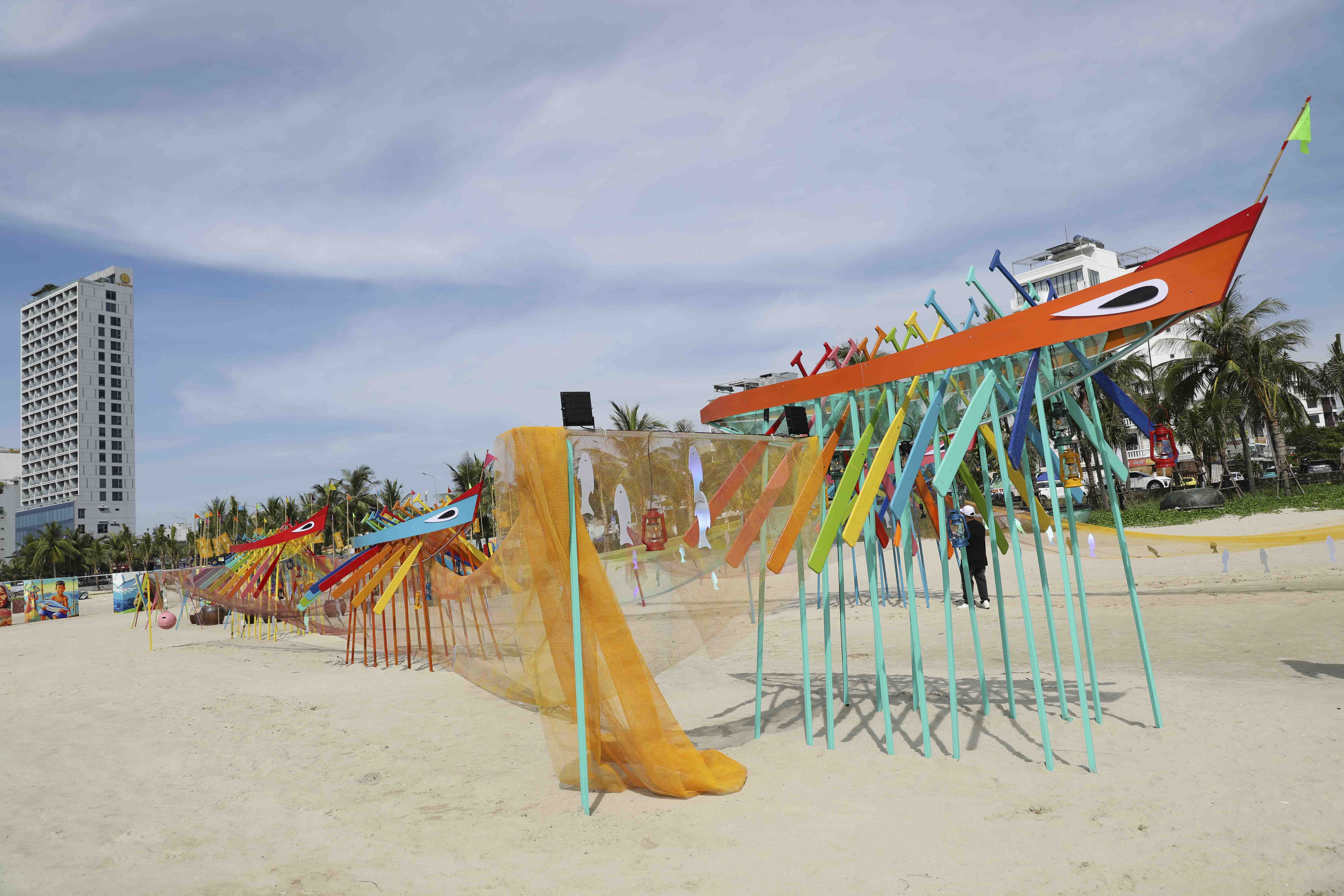“Không gian sắp đặt nghệ thuật Câu chuyện làng chài” tái hiện một cách trừu tượng, gợi hình về nhịp sống, sự gắn kết cộng đồng và mối liên hệ giữa con người với biển cả. Đến đây, du khách sẽ không chỉ chiêm ngưỡng những góc sắp đặt nghệ thuật độc đáo đầy màu sắc từ những vật liệu thông dụng của ngư dân mà còn có cơ hội được thưởng thức chương trình biểu diễn hát bả trạo, hoà tấu nhạc cụ trên bờ biển để tận hưởng một không gian giao lưu văn hoá sống động.