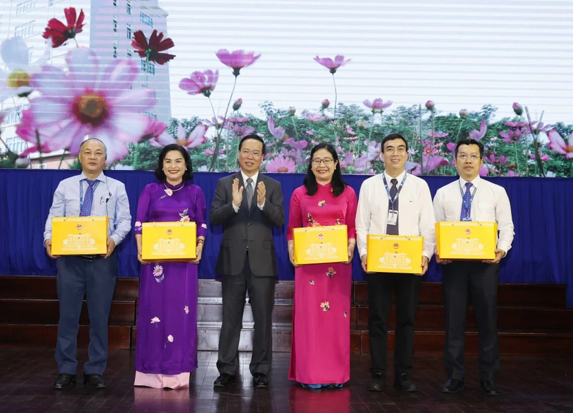 Chủ tịch nước Võ Văn Thưởng tặng quà cho các thầy cô giáo.(Ảnh: TTXVN)