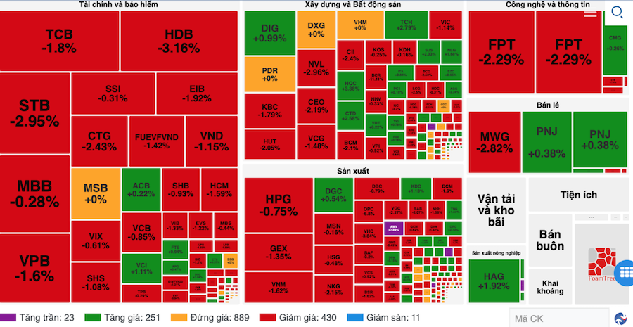 Độ rộng thị trường nghiêng về sắc đỏ với 415 mã giảm giá, 112 mã tăng và 68 mã tham chiếu.