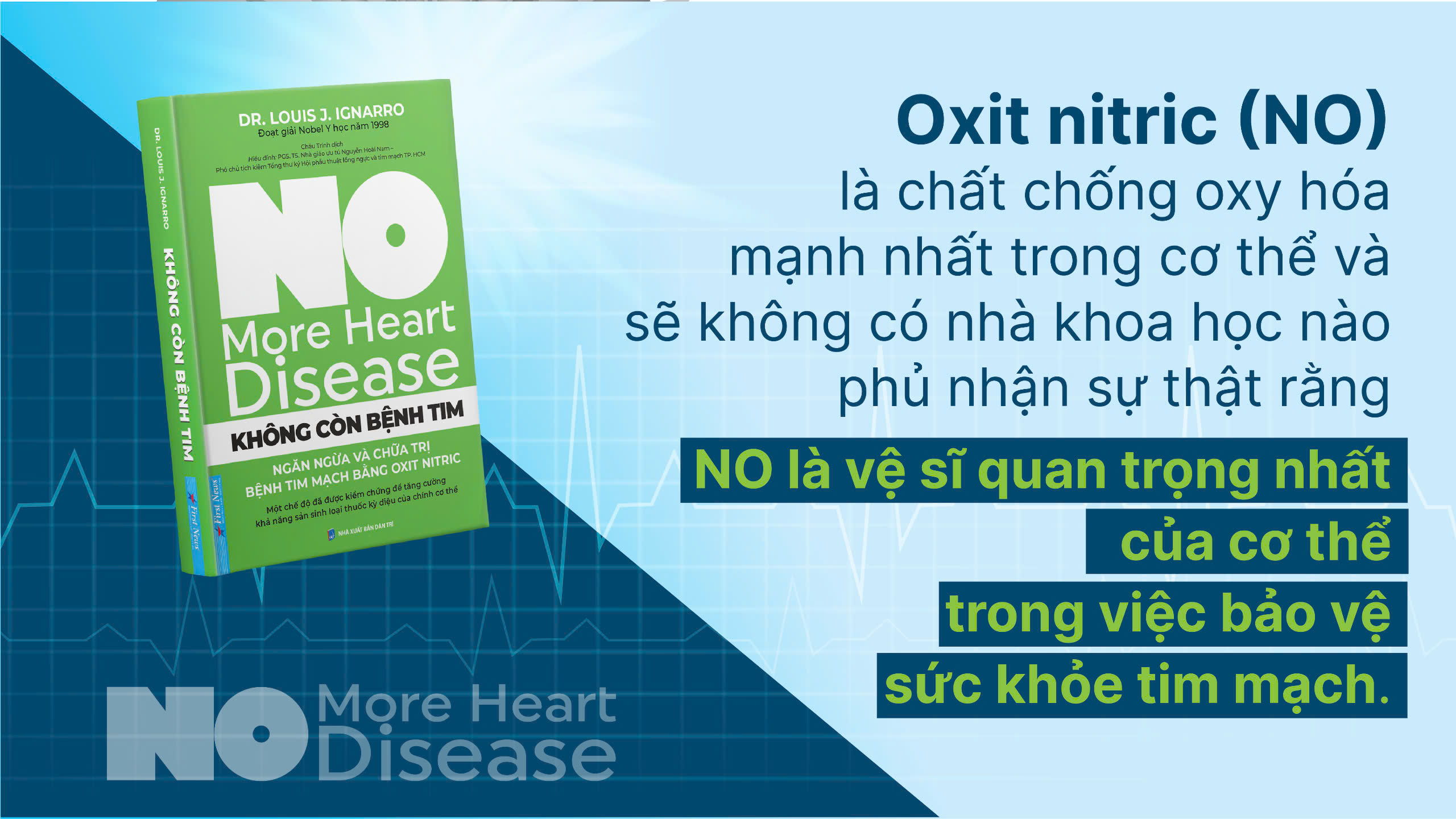 Trước đó, có lẽ ít ai ngờ rằng NO – một phân tử nhỏ bé từng được xem là chất độc trong công nghiệp – có thể trở thành “phân tử kỳ diệu” cứu sống hàng triệu người. Trong cuốn sách “Không còn bệnh tim” (No More Heart Disease) tiến sĩ Louis J. Ignarro – một trong ba nhà khoa học nhận giải Nobel – đã trình bày toàn bộ quá trình nghiên cứu mang tính cách mạng về NO và cách thức để khai thác sức mạnh của phân tử này trong việc bảo vệ sức khỏe của bạn.