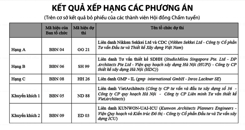 Trên cơ sở đánh giá, xếp hạng của Hội đồng chấm tuyển, Bộ Xây dựng đã phê duyệt kết quả và trao giải cho 5 phương án ý tưởng gồm: Hạng A, Hạng B, Hạng C và 2 giải Khuyến khích.