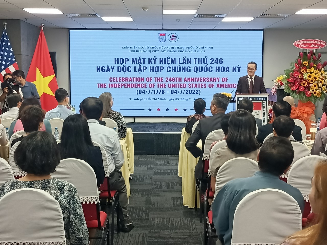 Phát biểu tại buổi lễ, bà Nguyễn Thị Ngọc Phượng, Chủ tịch Hội hữu nghị Việt – Mỹ TP.HCM đã gửi lời chúc tốt đẹp đến bà Marie C. Damour Tổng Lãnh sự quán Hoa Kỳ tại TP. HCM, các công dân Hoa Kỳ sinh sống, làm việc tại TP. HCM và bày tỏa niềm vui về quan hệ Việt Nam – Hoa Kỳ đã được cũng cố và phát triển những năm qua. Đồng thời tin tưởng quan hệ đối tác toàn diện Việt Nam – Hoa Kỳ tiếp tục phát triển, xứng đáng với kỳ vọng của Chính phủ và nhân dân hai nước.