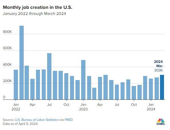 Số việc làm mới được tuyển dụng Mỹ từ tháng 1/2/22đến tháng 3/2024. Nguồn: Bộ Lao động Mỹ/ CNBC