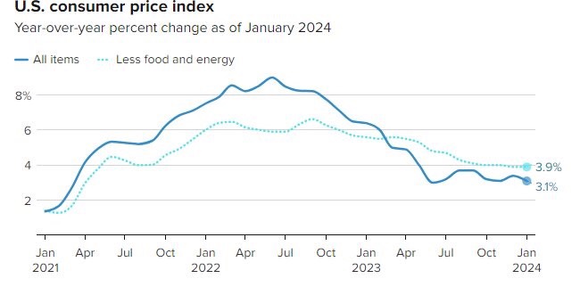 Số liệu Bộ Lao động Mỹ công bố hôm 13/2 cho thấy CPI của Mỹ tăng 0,3% trong tháng 1 và tăng 3,1% so với cùng kỳ năm ngoái, giảm từ mức 3,4% trong tháng 12.