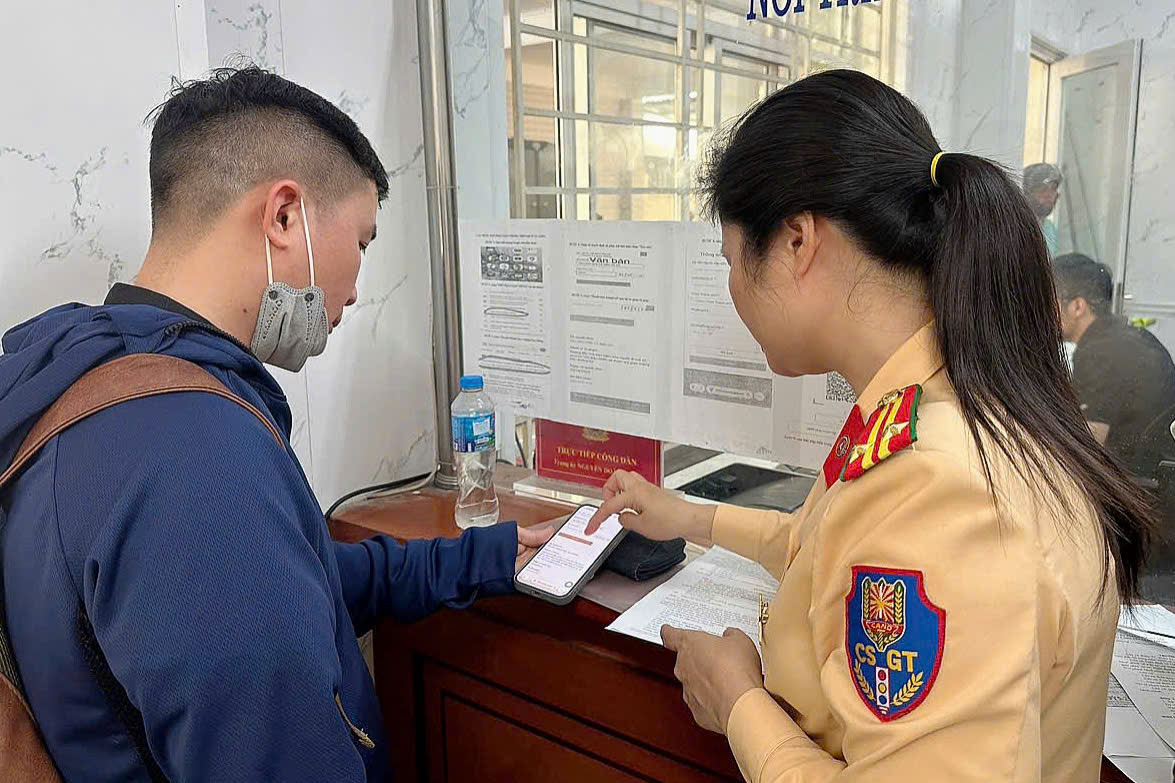 Cán bộ Đội CSGT đường bộ số 9 hướng dẫn người dân thực hiện nộp phạt qua dịch vụ công