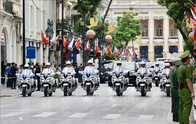 Đoàn xe hộ tống đưa Tổng thống Vladimir Putin tiến vào Phủ Chủ tịch, Chủ tịch nước Tô Lâm nồng nhiệt chào đón Tổng thống Vladimir Putin dẫn đầu Đoàn cấp cao Liên bang Nga.