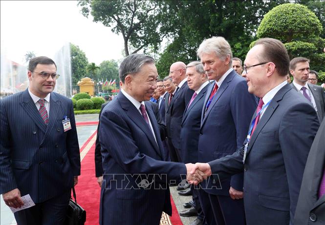 Trưa 20/6, Lễ đón chính thức Tổng thống Liên bang Nga Vladimir Putin được tổ chức trọng thể tại Phủ Chủ tịch theo nghi thức cao nhất dành đón Nguyên thủ quốc gia. Chủ tịch nước Tô Lâm chủ trì Lễ đón.
