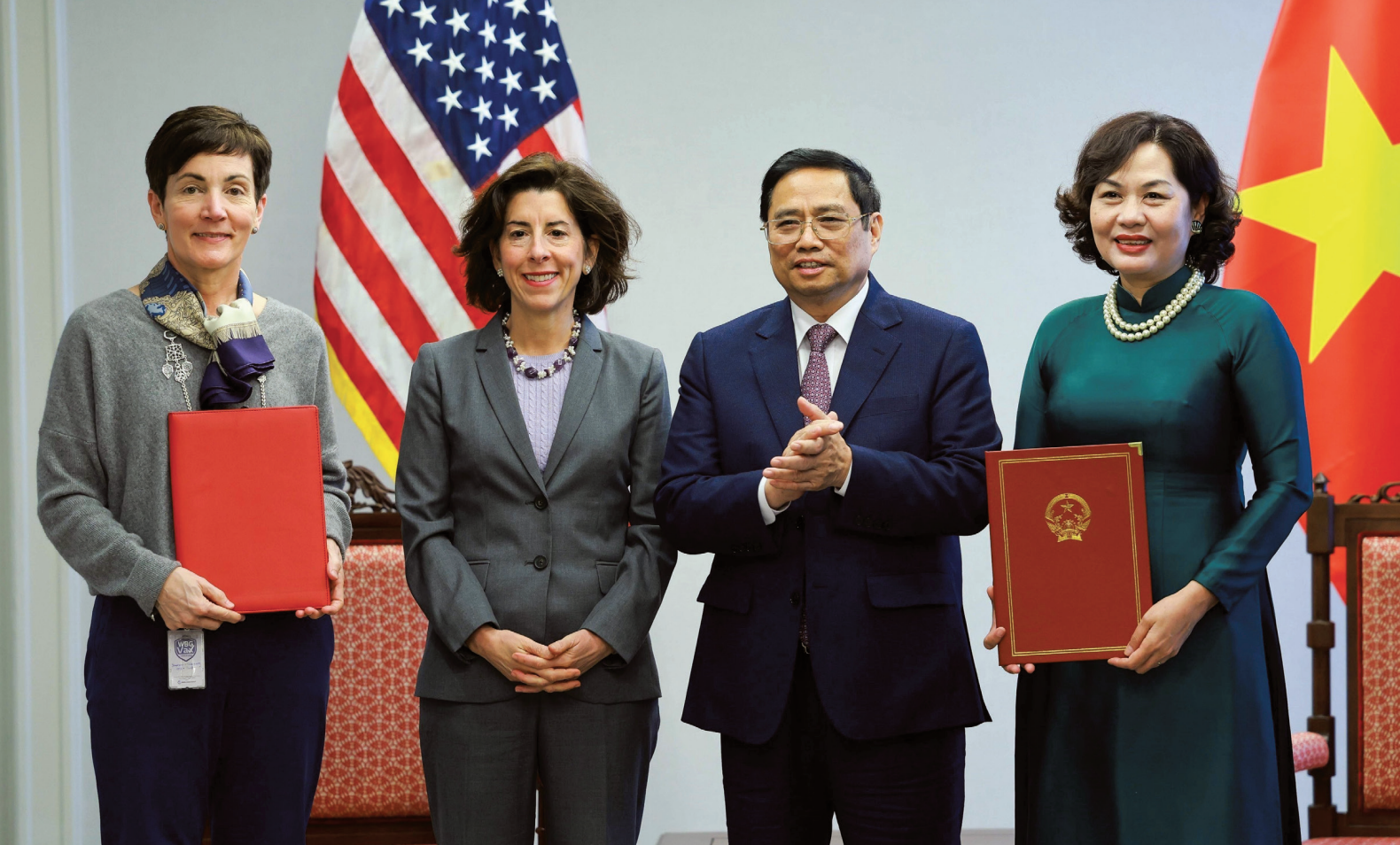 Thủ tướng Phạm Minh Chính cùng Bộ trưởng Thương mại Mỹ và thành viên đoàn chứng kiến lễ trao thỏa thuận hợp tác giữa Cơ quan phát triển thương mại Mỹ (USTDA), Công ty Black&Veatch Management và đại diện Công ty TNHH kết nối năng lượng sạch Mê Kông thỏa thuận tài trợ thực hiện nghiên cứu khả thi Dự án đường dây truyền tải điện Bạc Liêu