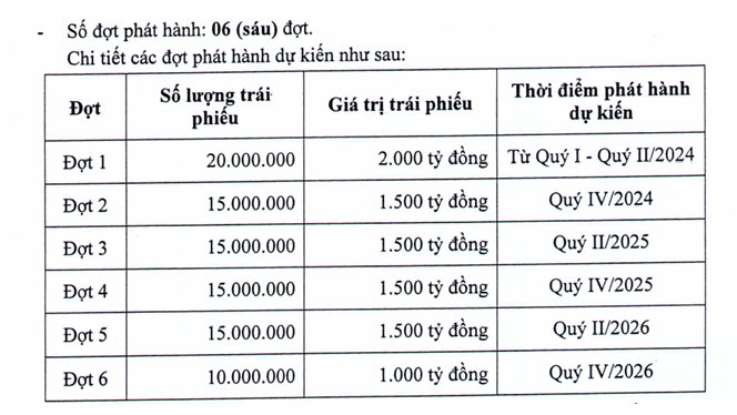 Năm 2025 ngân hàng sẽ phát hành đợt 3 là 1.500 tỷ đồng vào quý 2/2025, đợt 4 là 1.500 tỷ đồng vào quý 4/2025. Năm 2026 ngân hàng phát hành trái phiếu đợt 5 là 1.500 tỷ đồng vào quý 2/2026, đợt 6 là 1.000 tỷ đồng vào quý 4/2026.