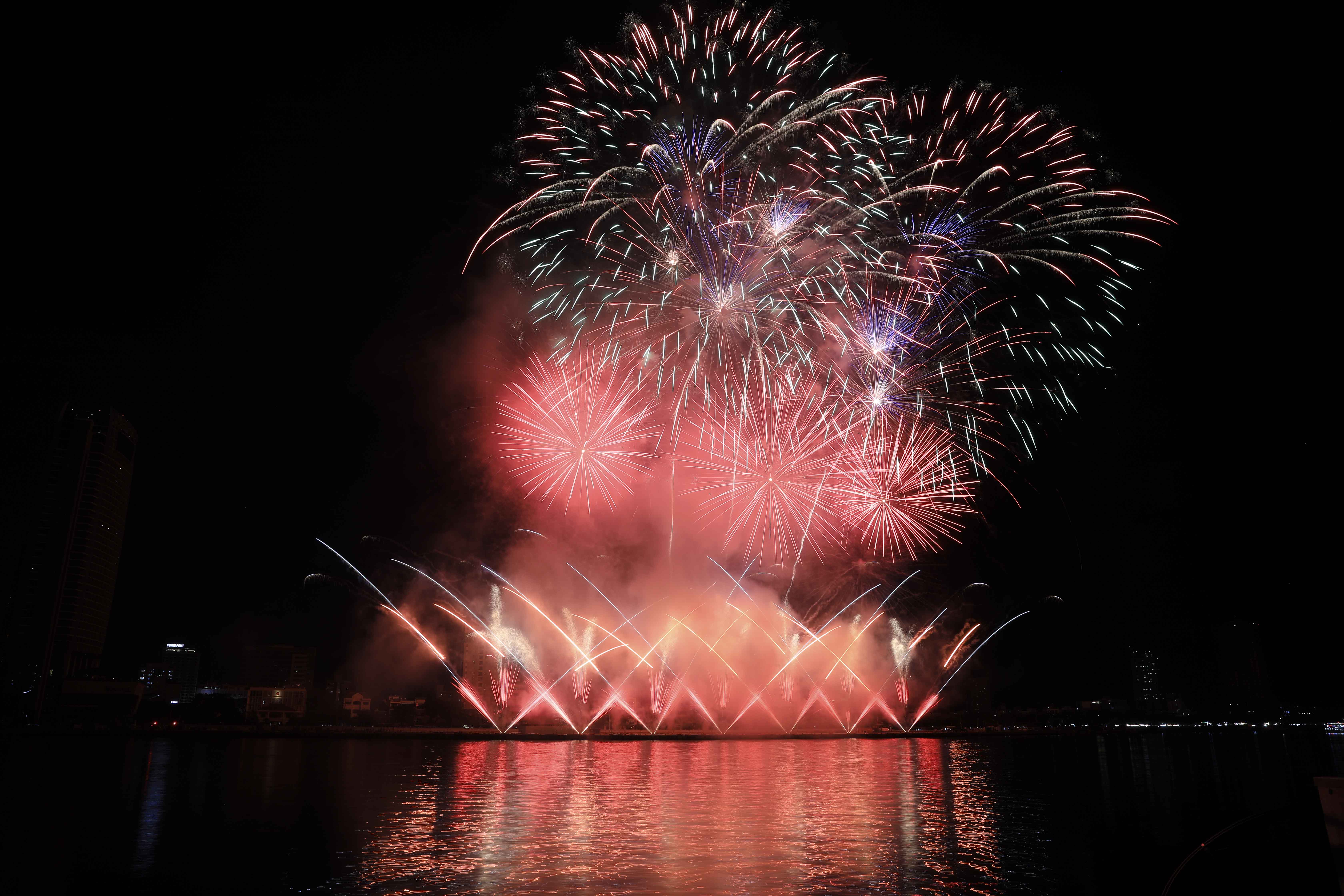 Khi âm nhạc bắt đầu sôi động cũng là lúc các đợt pháo hoa bùng nổ, tỏa tia sáng rộng và rực rỡ hơn bao giờ hết. Tạo hình tựa như những chú chim sải cánh bay cao chính là biểu trưng cho sự phát triển và thăng hoa của thành phố biển xinh đẹp, lòng hiếu khách của người dân Đà Nẵng. Đỉnh cao là những chùm pháo cuối cùng được bung nở liên tiếp, đan cài hàng trăm hiệu ứng ánh sáng cùng lúc, khiến người xem choáng ngợp và thích thú. Hình ảnh đợt pháo tựa như bàn tay nắm chặt trên bầu trời dần lịm đi trong bầu trời đêm sông Hàn là một trong những giây phút đáng nhớ nhất của đêm khai mạc. Pháo hoa đã tắt nhưng thắp lên là thông điệp mạnh mẽ về tình đoàn kết và hữu nghị giữa các dân tộc.