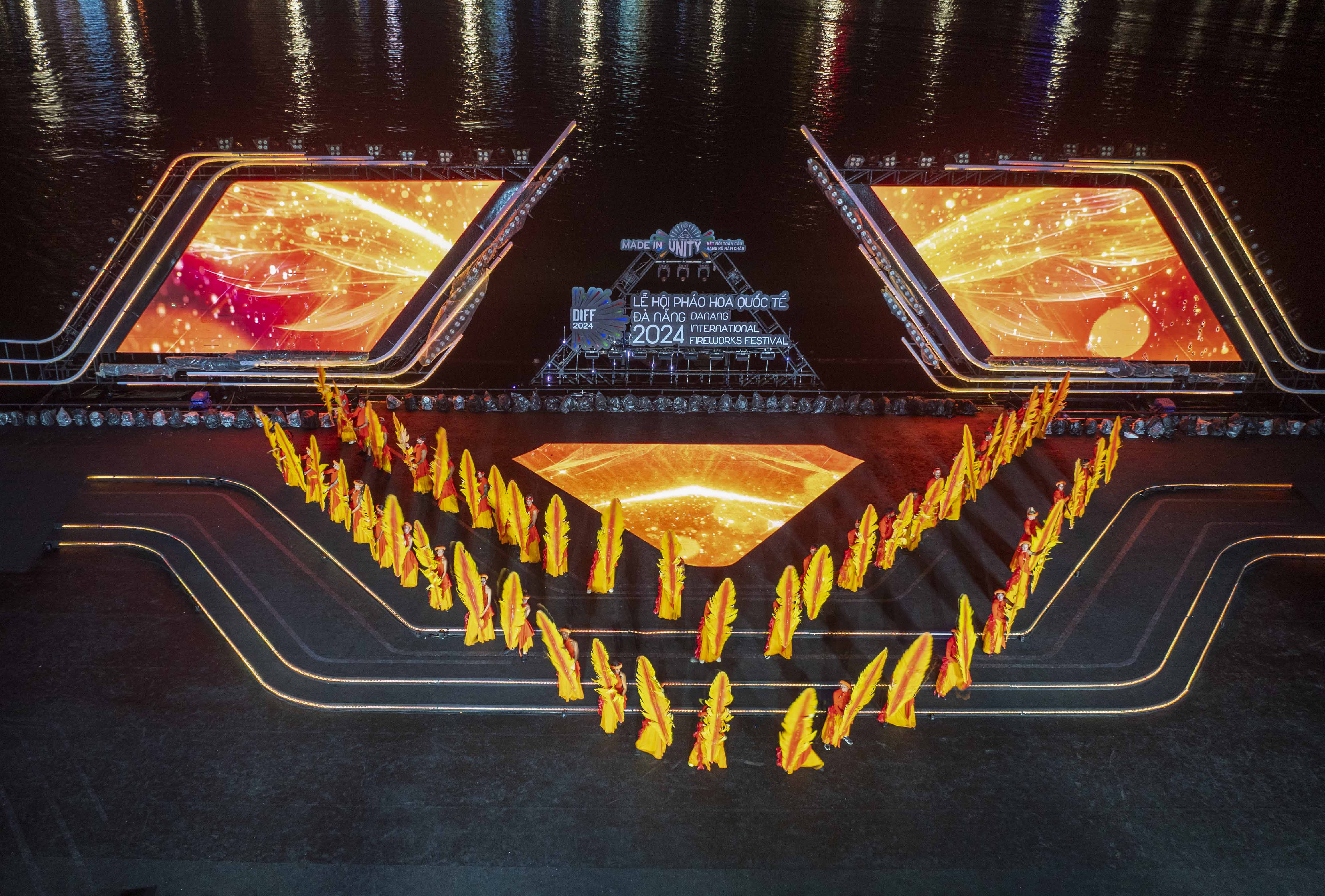 Bên cạnh cuộc so tài gay cấn bằng ánh sáng và âm thanh đến từ các đội thi, khán giả đến với khai mạc DIFF năm nay còn được thưởng thức một không gian nghệ thuật đặc sắc chưa từng có. Sân khấu được thiết kế lấy cảm hứng từ hình ảnh “bàn tay” với những ngón tay vươn cao, như thể đang nâng đỡ những chùm pháo bung tỏa rạng rỡ trên bầu trời, nhấn mạnh thông điệp sâu sắc về sự kết nối.