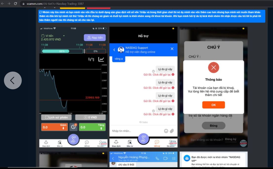 Một nạn nhân của sàn NASDAQ68 kể lại: “Tôi nạp vào sàn này gần 2 tỷ đồng như họ đánh cháy hết và không cho rút tiền. Khi tôi liên hệ với bộ phận chăm sóc khách hàng hoặc các chuyên gia đọc lệnh thì họ đuổi chúng tôi ra khỏi nhóm zalo hoặc telegram.