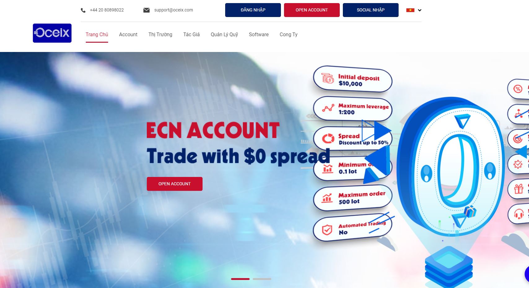 Giao diện của sàn forex OCEIX, hoạt động trái pháp luật tại Việt Nam
