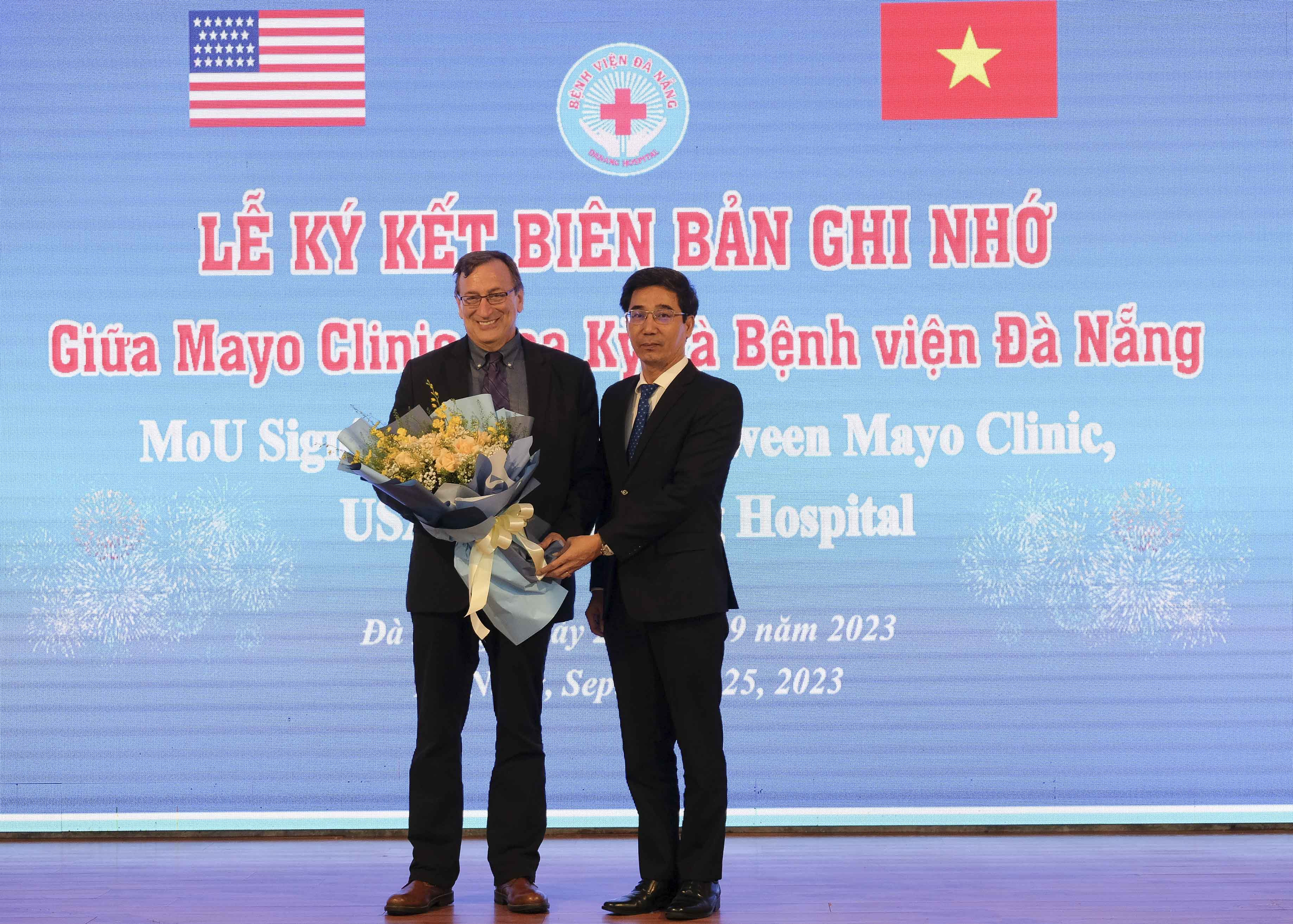 Phó Chủ tịch UBND TP Đà Nẵng Trần Chí Cường (bên phải) tặng hoa GS. James Bower, Giám đốc Chương trình hợp tác y tế toàn cầu của Mayo Clinic (Hoa Kỳ).