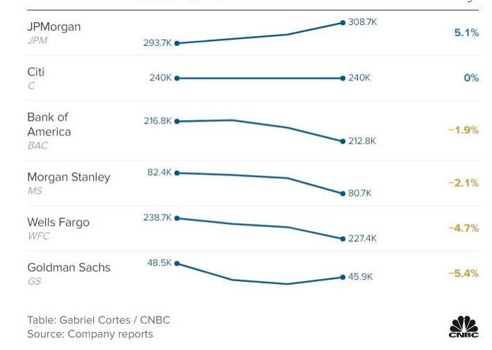 Theo hồ sơ của công ty, năm ngân hàng lớn nhất tiếp theo của Hoa Kỳ đã cắt giảm tổng cộng 20.000 vị trí trong năm nay.