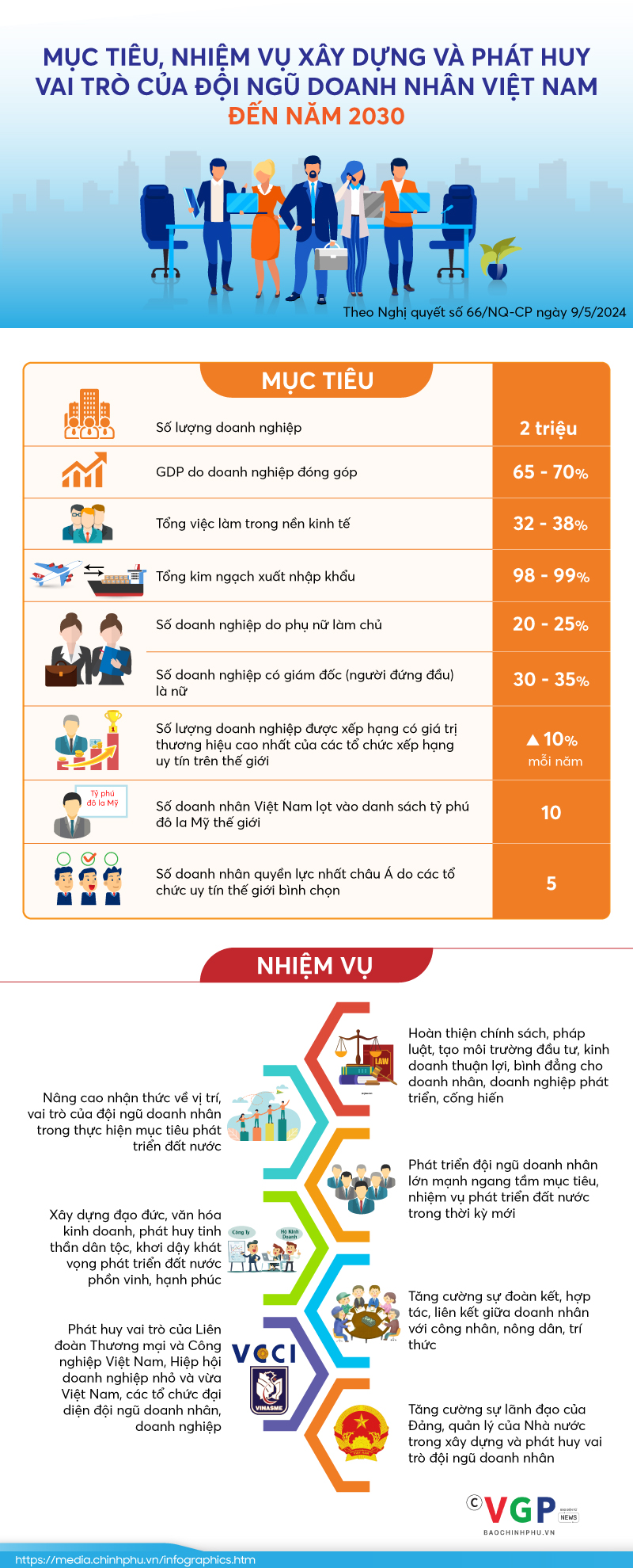 TCVM - Mục tiêu từ nay đến năm 2030, có ít nhất 2 triệu doanh nghiệp, trong đó hình thành và phát triển nhiều doanh nhân lãnh đạo các tập đoàn kinh tế mạnh.