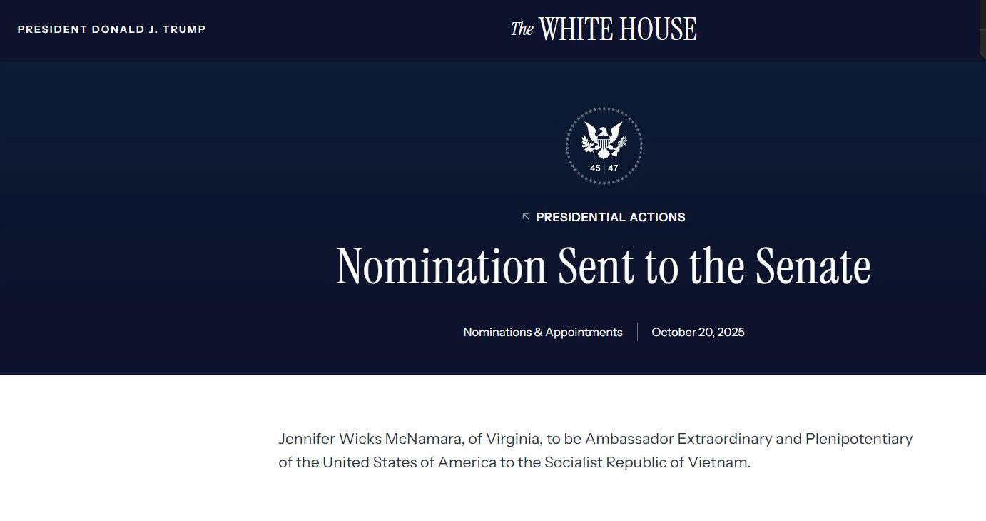 Nhà Trắng ngày 20/10/2025 đã chính thức gửi Thượng viện Mỹ đề cử bà Jennifer Wicks McNamara, bang Virginia, giữ chức Đại sứ Đặc mệnh Toàn quyền của Hoa Kỳ tại Việt Nam.