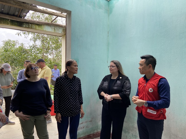 Tổng Lãnh sự Mỹ Marie Damour (thứ 2 từ phải sang) và Giám đốc USAID Ann Marie Yastishock (trái) thăm một gia đình bị thiệt hại do lũ lụt tại Quảng Nam. (Ảnh: ĐSQ Mỹ)