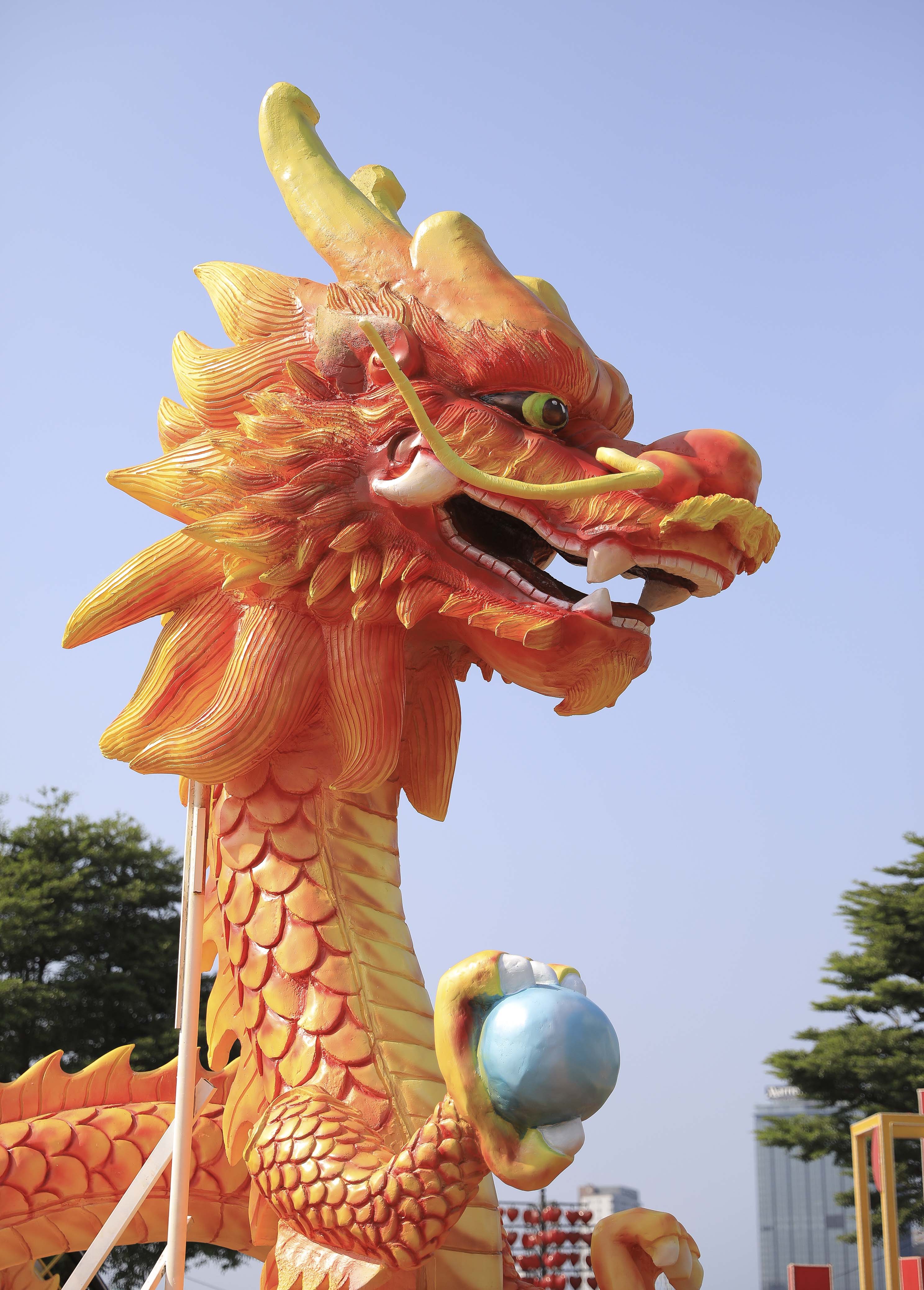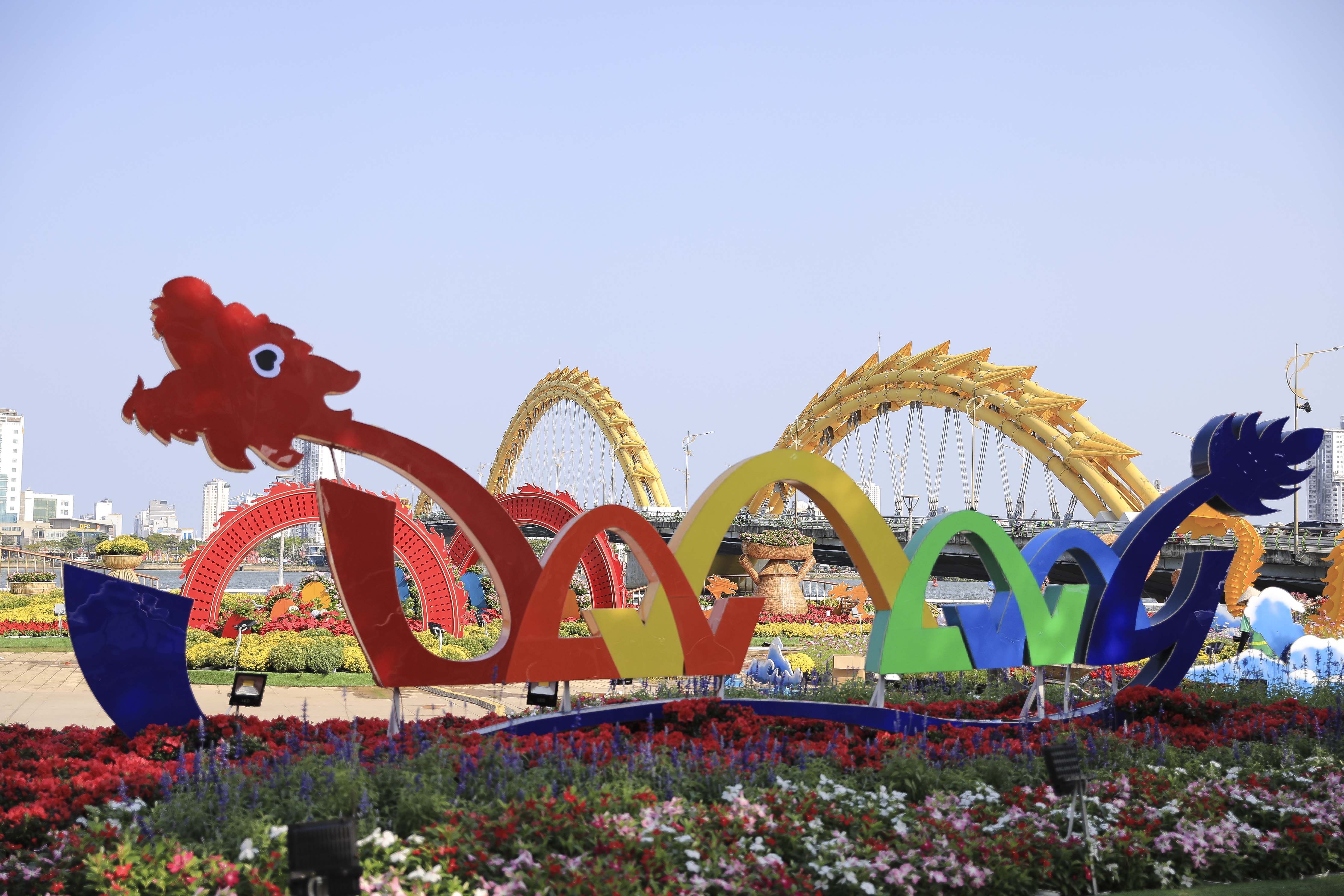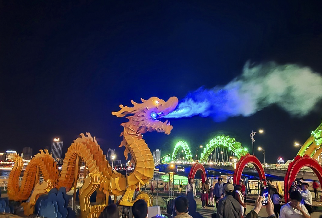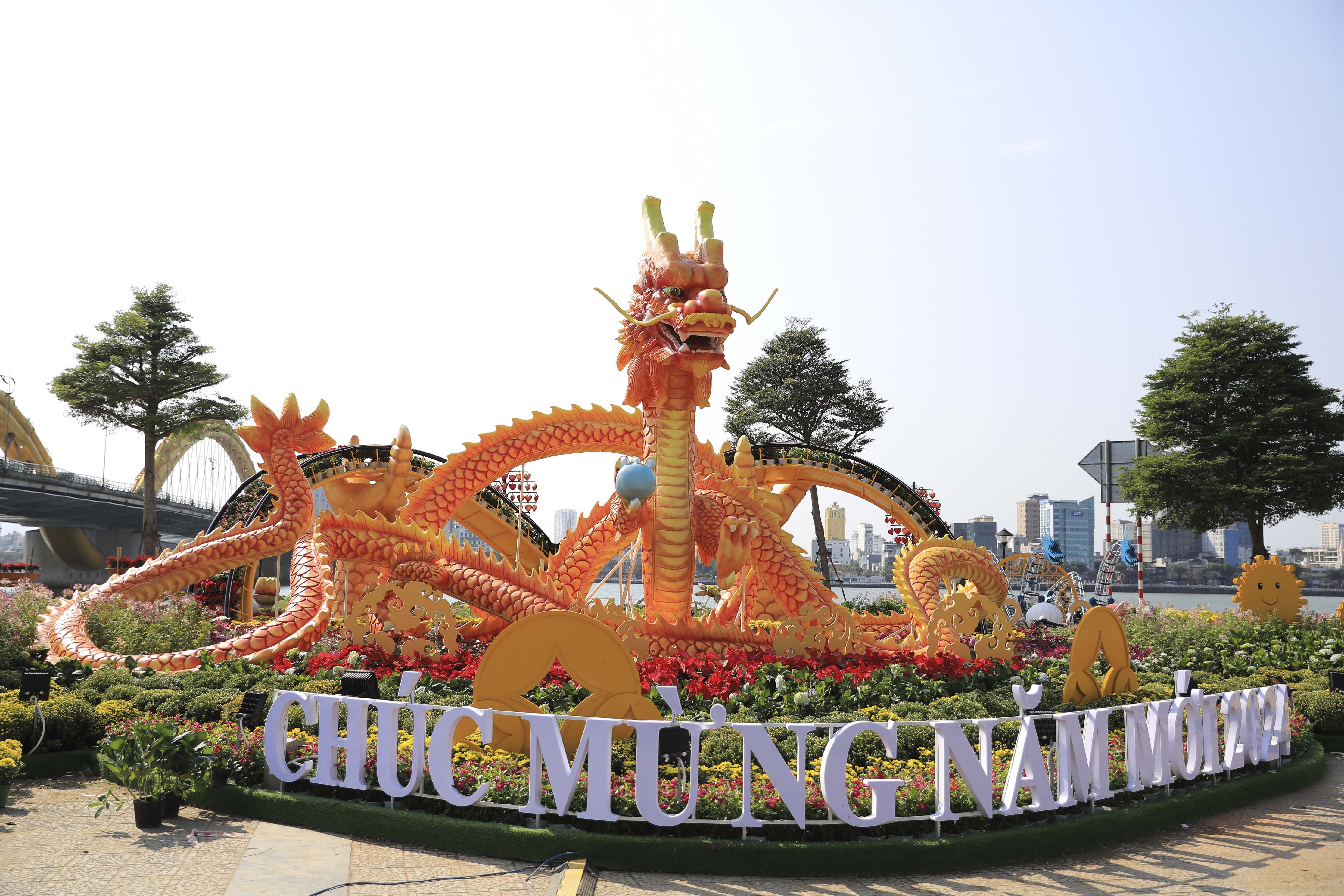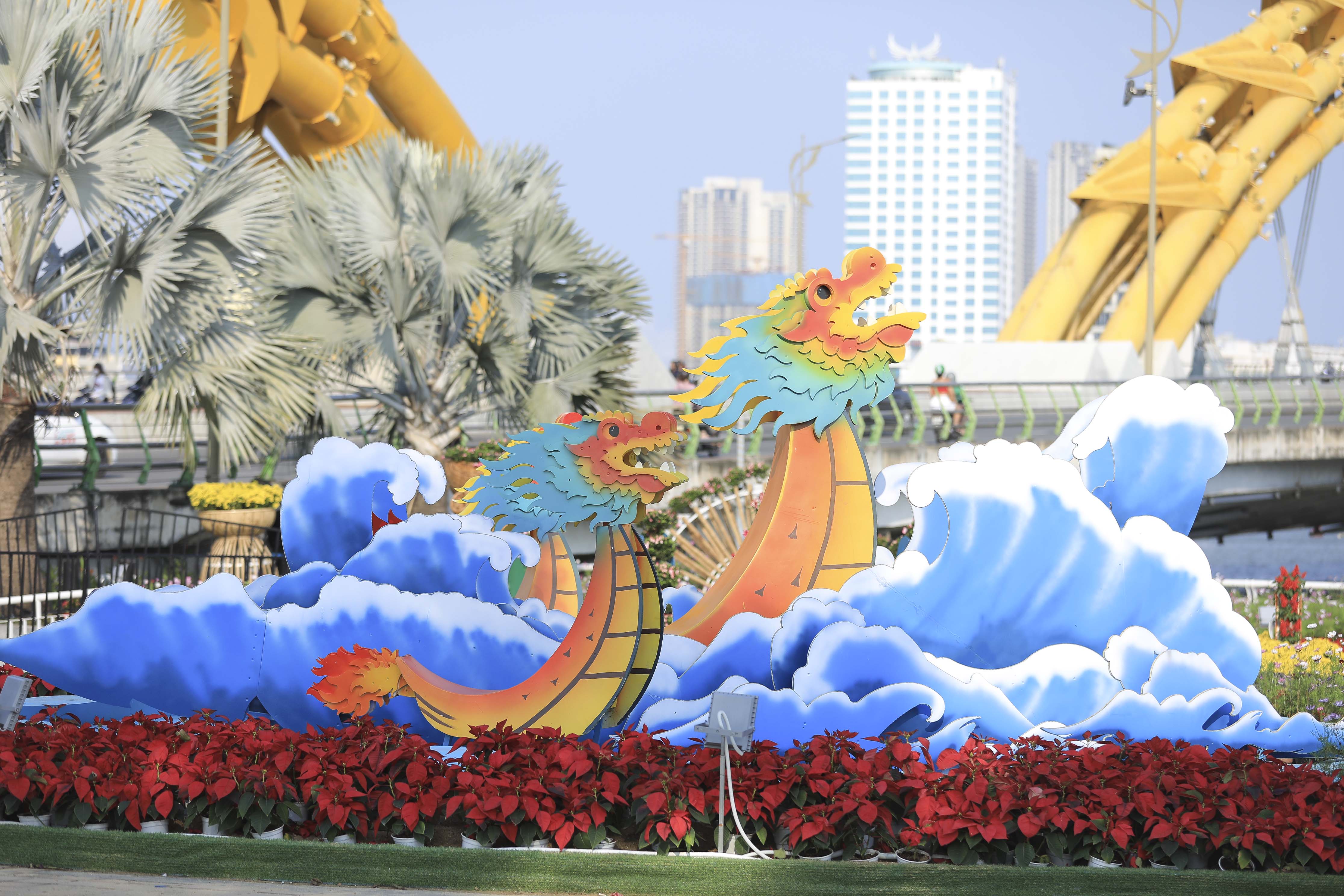 Nổi bật là linh vật rồng dài 50m, nặng gần 1 tấn đặt tại cụm trang trí ở đầu cầu Rồng (đường Trần Hưng Đạo, quận Sơn Trà)...