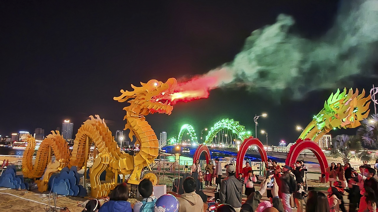 TCVM - Dàn linh vật rồng ở Đà Nẵng với nhiều hình dáng và sắc thái nhận được nhiều lời khen. Đặc biệt có linh vật mô phỏng cầu rồng có thể phun nước, phun lửa.