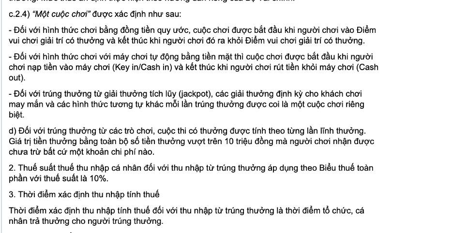 Thuế suất thuế thu nhập cá nhân đối với thu nhập từ trúng thưởng là 10%. Thu nhập từ trúng thưởng trong một cuộc chơi là chênh lệch giữa số tiền mặt người chơi nhận lại trừ đi số tiền mặt đã chi ra trong một cuộc chơi.
