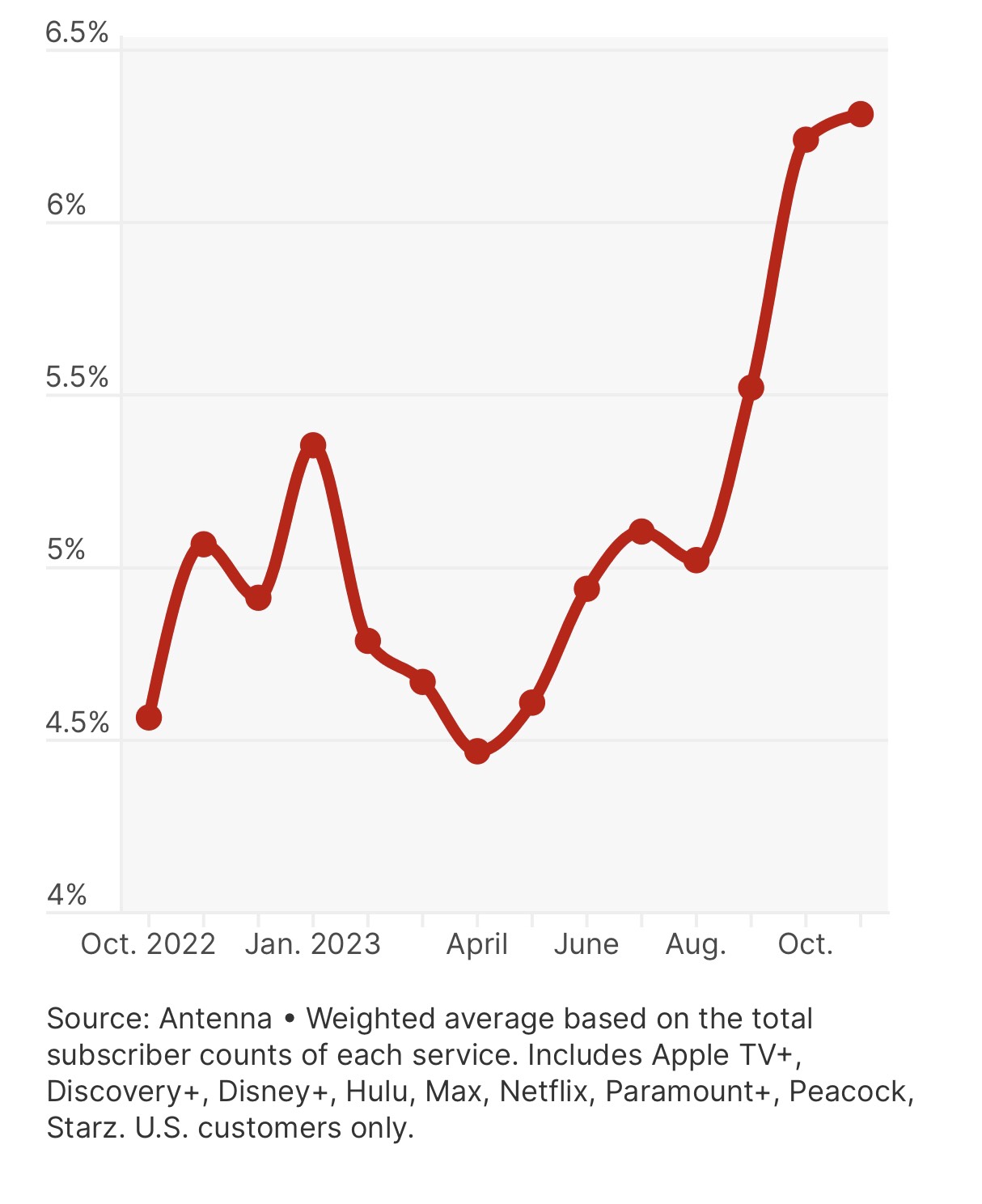 Tỷ lệ người dân ở Hoa Kỳ ngừng đăng ký các gói dịch vụ phát trực tuyến lớn như Apple TV+, Discovery+, Disney+, Hulu, Max, Netflix, Paramount+, Peacock và Starz đã tăng lên 6,3% vào tháng 11 năm 2023 từ mức 5,1% một năm trước đó, theo dữ liệu từ nhà cung cấp dịch vụ phân tích đăng ký Antenna.