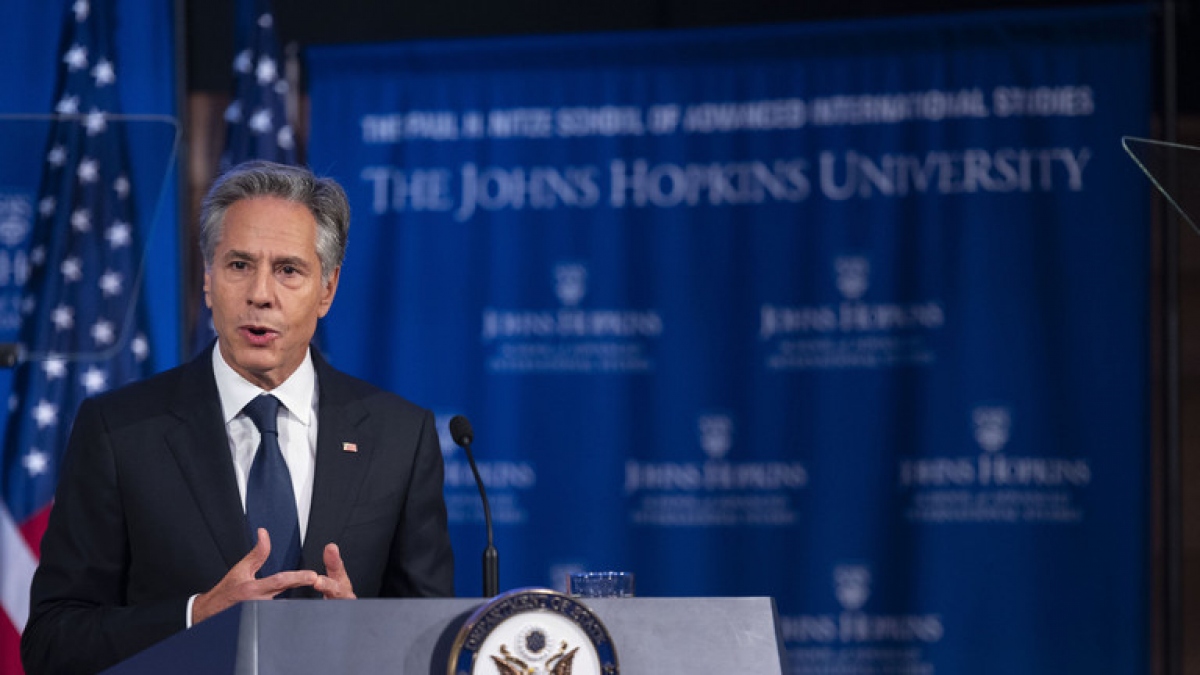 Ngoại trưởng Mỹ Antony Blinken phát biểu tại Đại học John Hopkins. Ảnh: AP.