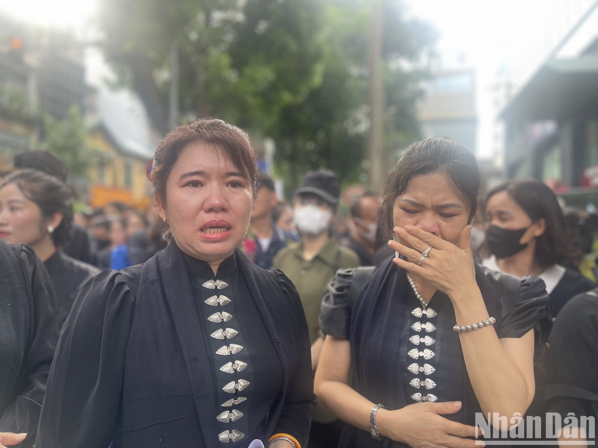 Chị Cầm Cẩm Thơ (đại diện nhóm đồng bào và sinh viên dân tộc Thái tại Hà Nội) khóc nghẹn khi cùng nhóm khoảng 20 người đứng ở ngoài cổng Yec-xanh chờ vào viếng Tổng Bí thư.