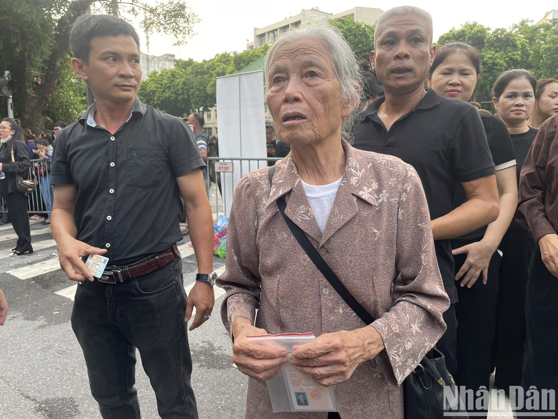 Cầm trên tay tấm thẻ đảng viên vào viếng Tổng Bí thư, bà Hoàng Thị Mến (80 tuổi) tự hào cho biết bà đã có 60 năm tuổi Đảng từ tháng 5 vừa qua. Đi từ Nam Định lên bến xe Mỹ Đình, rồi đi xe ôm tới đây, có mặt từ 5 giờ sáng trước phố Trần Thánh Tông, mặc dù tuổi cao sức yếu, bà vẫn kiên nhẫn đợi chờ để được vào viếng.