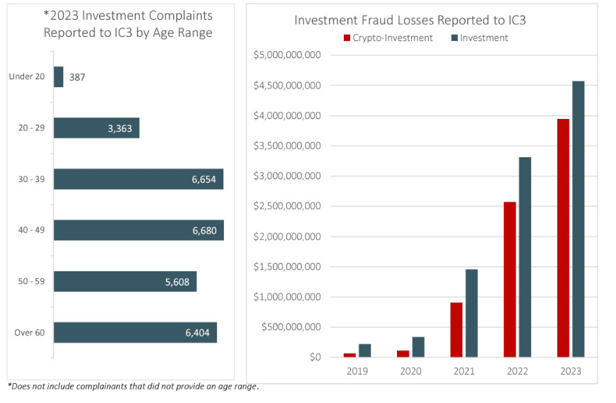 Hơn 1/3 ($4.5 tỷ) trong số $12.5 tỷ tiền lừa đảo qua mạng được báo cáo năm 2023 là lừa đảo đầu tư, trong đó có nhiều vụ bọn tội phạm giả bộ làm người tình của ai đó rồi dụ dỗ họ đầu tư vào dự án tiền ảo giả mạo, theo FBI.