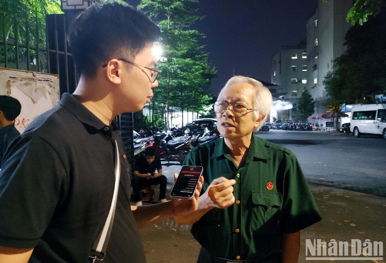 Người dân xếp hàng bên ngoài Nhà tang lễ quốc gia (số 5 Trần Thánh Tông, Hà Nội), chờ viếng Tổng Bí thư Nguyễn Phú Trọng, tối 25/7/2024.