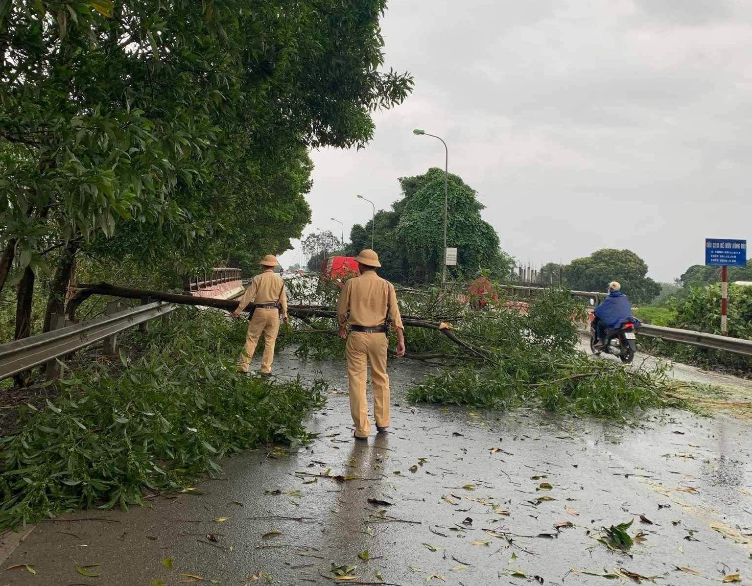 Cũng trong sáng nay, trên đường gom đại lộ Thăng Long một cây lớn đã đổ ngang đường. Đây cũng là lý do gây ùn ứ trên toàn tuyến. Ngay khi nhận được tin báo, Đội Cảnh sát giao thông số 11, Phòng Cảnh giao thông đã cử tổ công tác do Trung tá Bùi Xuân Phương ứng trực tại điểm xảy ra sự cố và thông báo cho các phương tiện di chuyển tránh khu vực nguy hiểm.