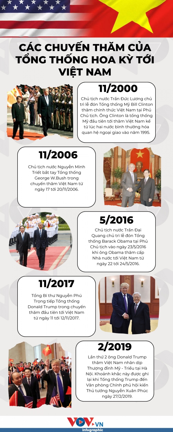 Trong đó, riêng Tổng thống Donald Trump thăm Việt Nam hai lần. Lần một là vào tháng 11-2017, khi ông đến Việt Nam dự Hội nghị cấp cao APEC. Thời điểm đó ông Trump là tổng thống Mỹ đầu tiên thăm Việt Nam ngay trong năm đầu tiên của nhiệm kỳ tổng thống. Lần hai là vào tháng 2-2019, khi ông Trump sang Việt Nam dự Hội nghị thượng đỉnh Mỹ - Triều Tiên.