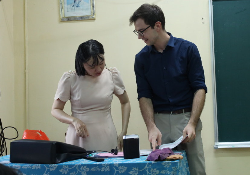 Tình nguyện viên Mỹ (phải) và giáo viên Việt Nam trong một giờ học Tiếng Anh ở TP HCM. Ảnh: Quân đoàn Hòa bình